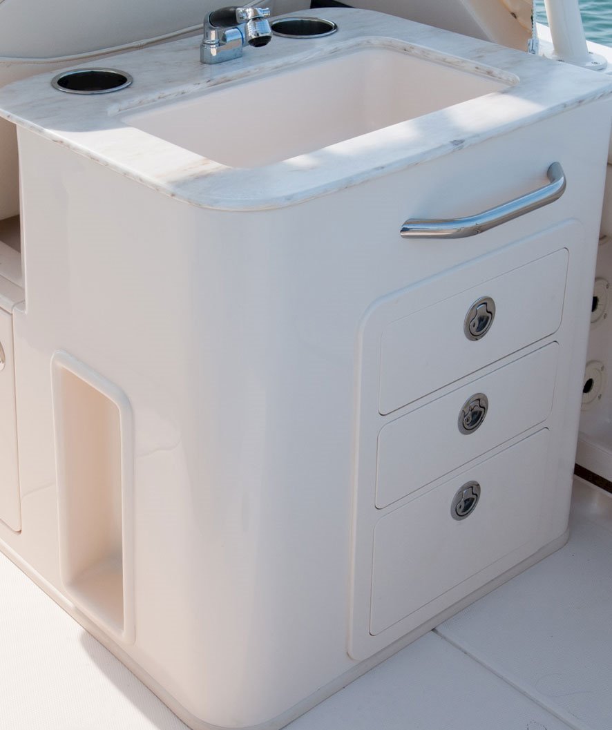 The Freedom line still has one foot firmly planted in fishing, and the other dangling somewhere over the side with its toe only slightly in the water. While Grady-White does offer a ski pylon as optional equipment, that is about as far as it goes to accommodate the skiing, wake boarding and tubing boaters. Further, Grady-White knows that scuba diving is best done from boats, yet we find no scuba racks on the options list, nor does its swim platform with four-step ladder lend itself to a person loaded with scuba gear climbing back aboard. There is no side-opening door on the options list.