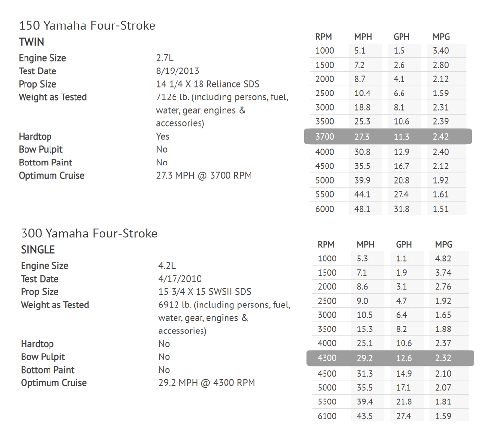 Why such a difference when both boats had 300-hp in total? Two important reasons: 1) the 150 Yamahas are 2.7 L displacement each which totals 5.4 L for both, compared to 4.2 L displacement for the single 300. (No replacement for displacement?) 2) The twins were swinging two 14-1/4" x 18" (36.2 cm x 45.72 cm) props, compared to the 300’s single 15-3/4" x 15" (40 cm x 38.1 cm) prop, so the twins simply had much blade surface in the water than the single. It is blade surface that turns engine horsepower into thrust. Even though the 300 had a larger diameter prop, it couldn’t come close to matching the blade surface area of two slightly smaller props. This also means that the G-W 255 Freedom powered by twins has much more weight-carrying capacity for a given speed than the single engine-powered boat. The final piece of the puzzle is the cost of the engines. Two loose 150s will cost about $4,500 more than a single loose 300.