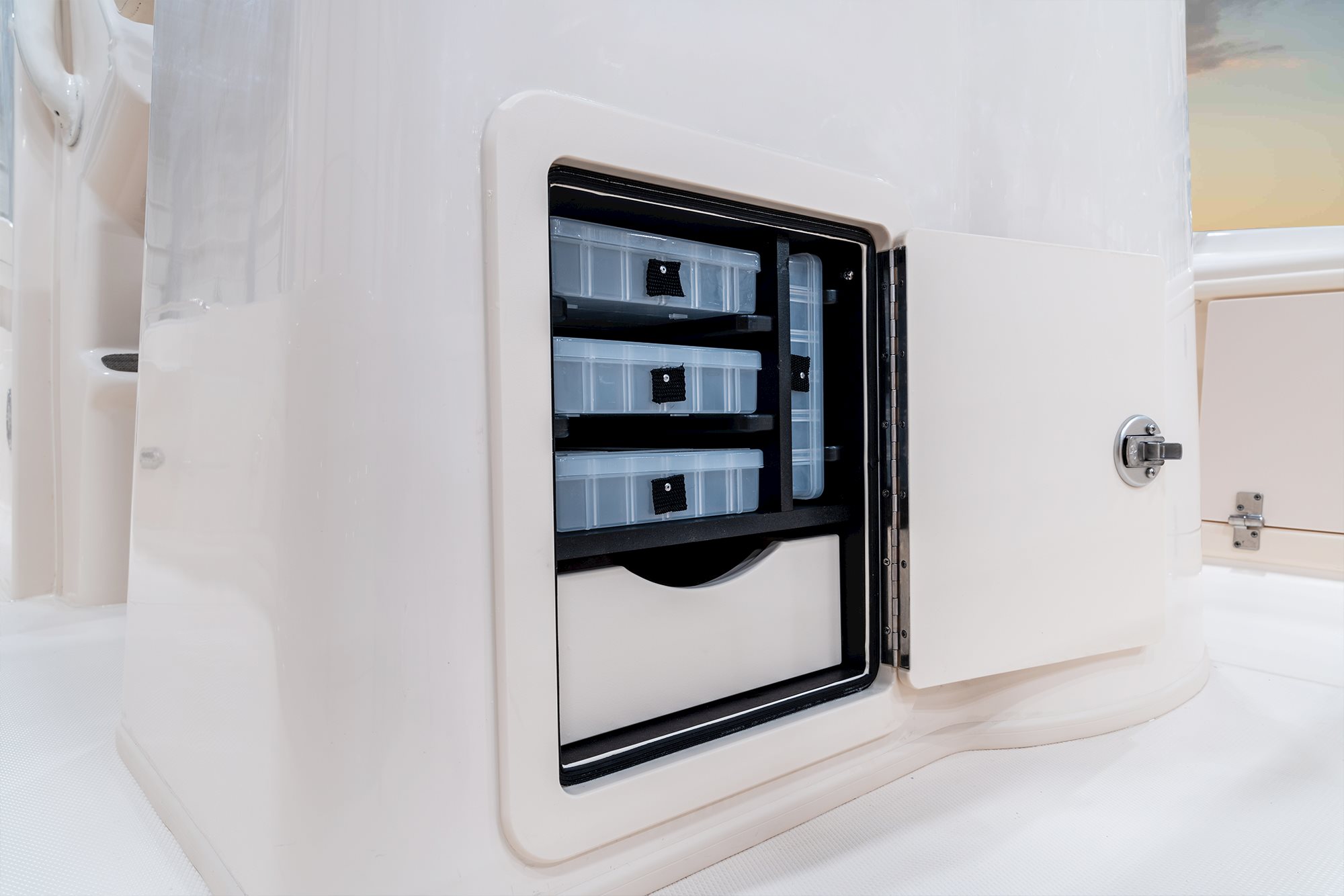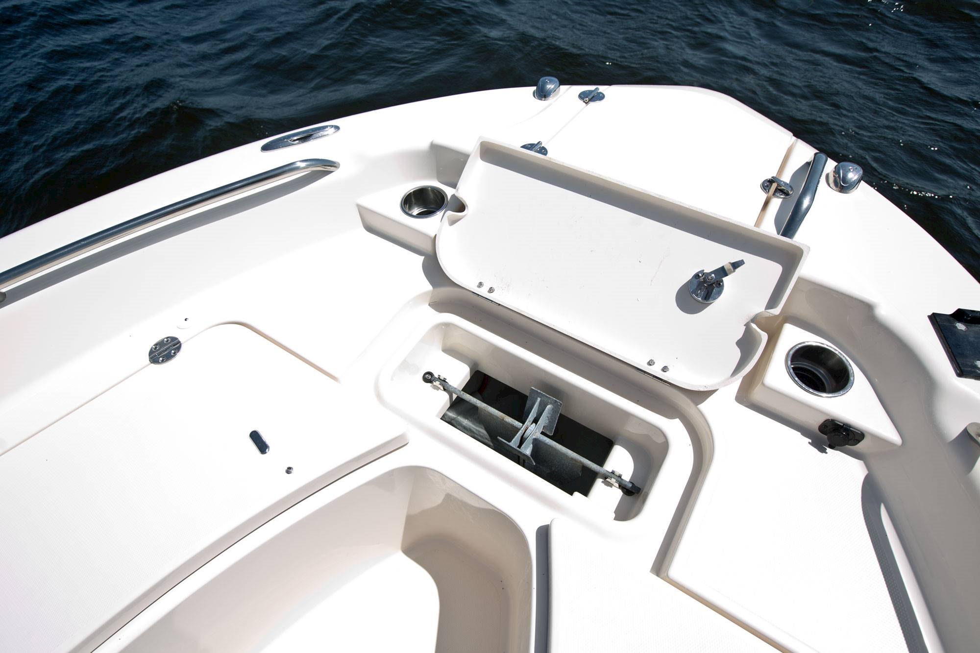 Also includes an insulated 25-gallon (95 L) livewell located under the observer’s seat. The catch can be deposited in one of the two standard 74-quart (81.5 L) fish boxes that make up the bow seats/casting deck.