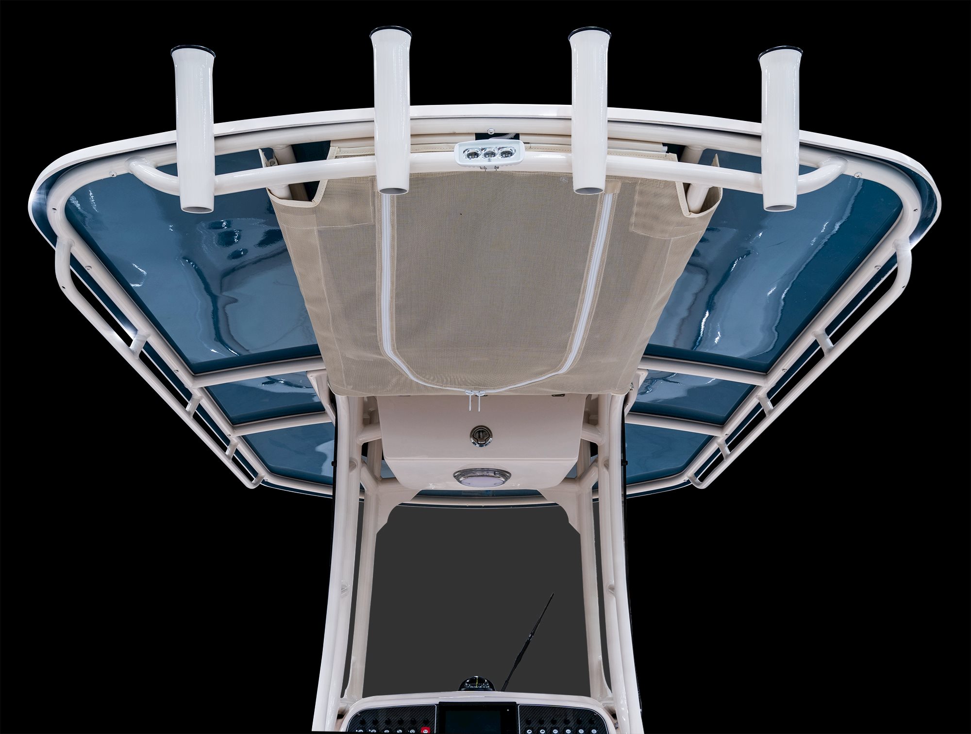 Being, first of all, a center console, it’s hard to start anywhere other than with the fishing features. (The family amenities run a close second.) Be that as it may, the fishing category needs to start with a mention of the 47-sq. ft. (4.37 sq. m) cockpit area. This provides plenty of room to move about on deck without any feeling of being constricted by seating or the leaning post. As noted above, the supports for the optional T-top are bolted to the console and not the deck, making moving around the console non-problematical for even portly anglers.