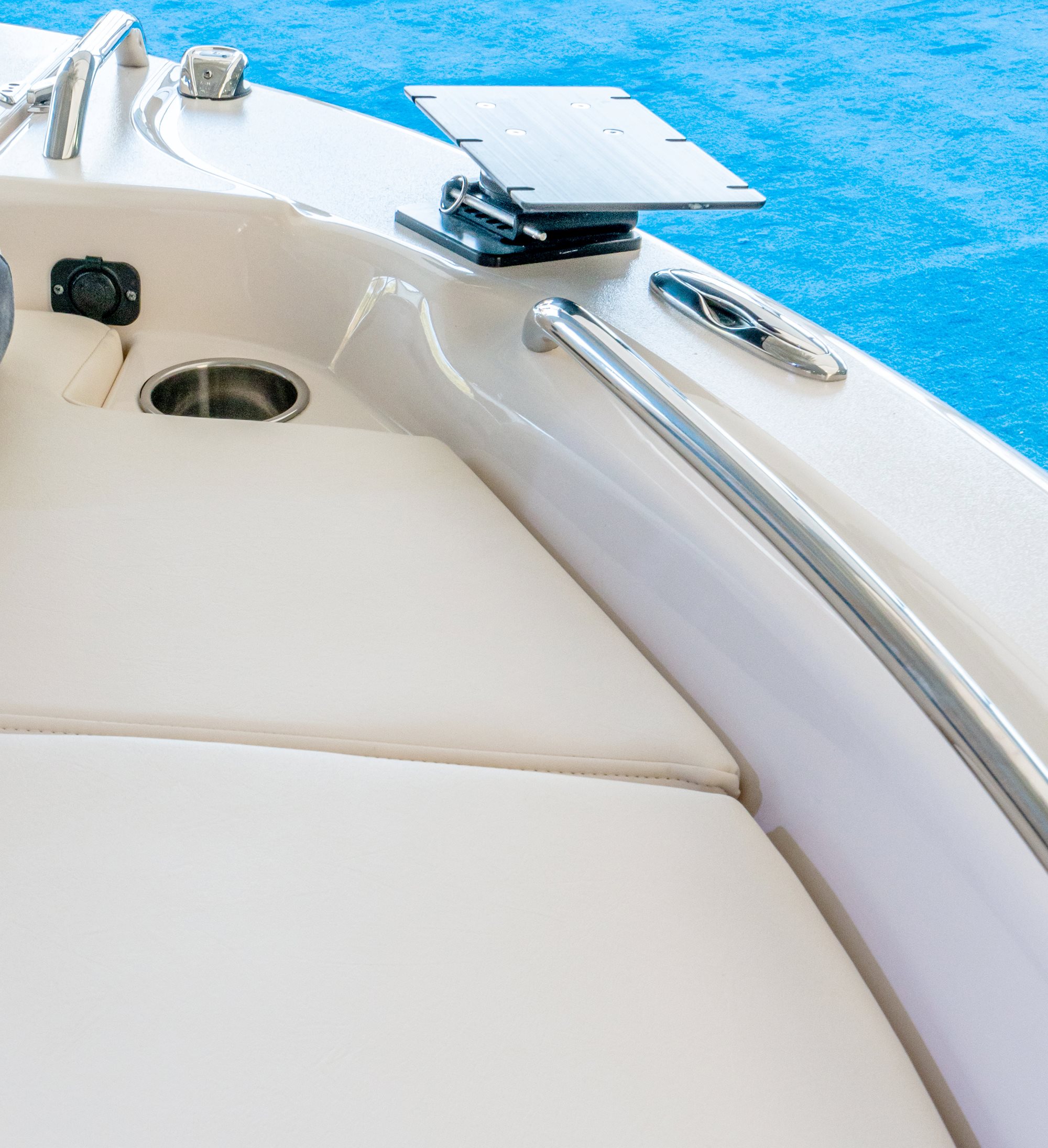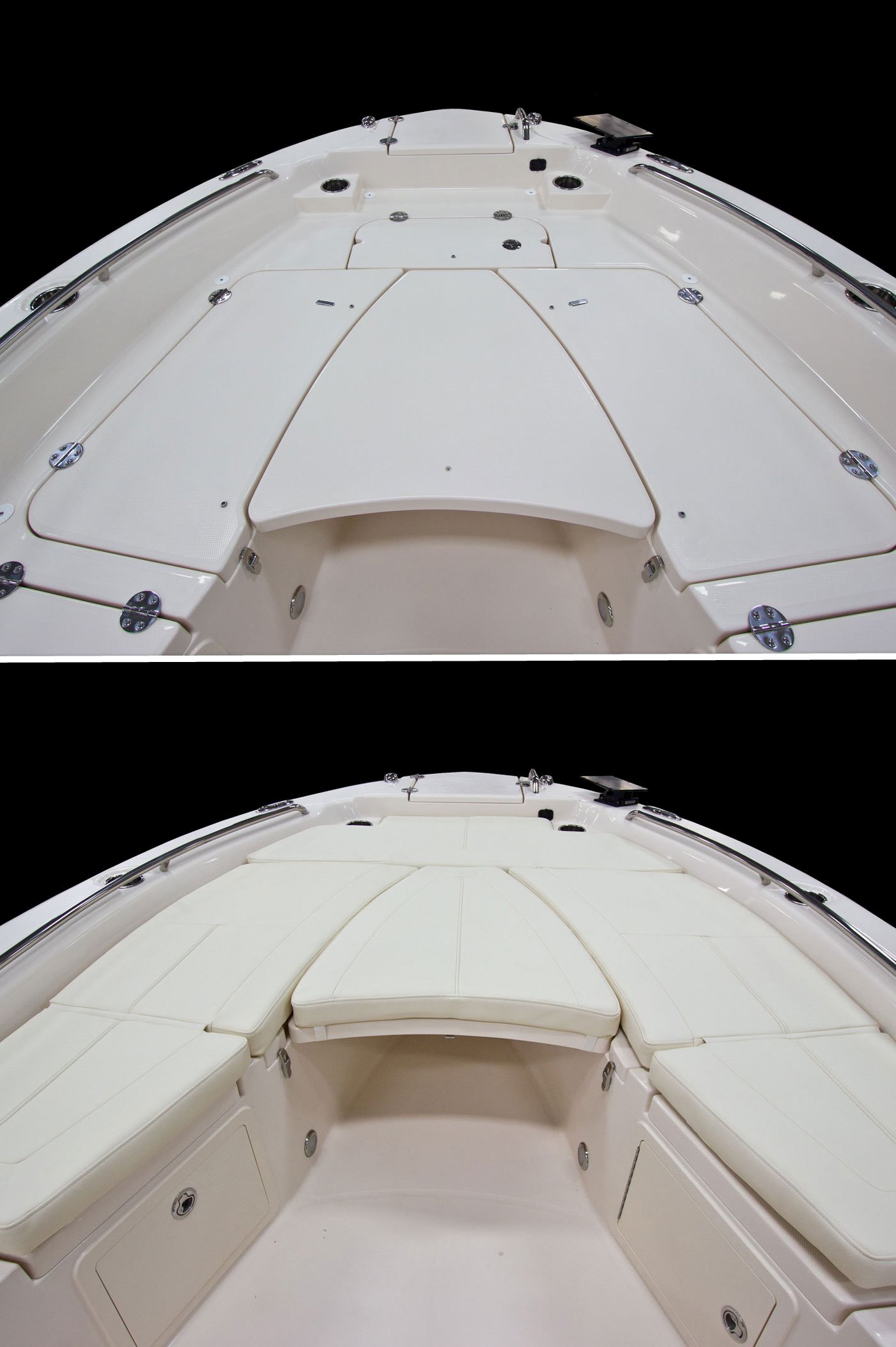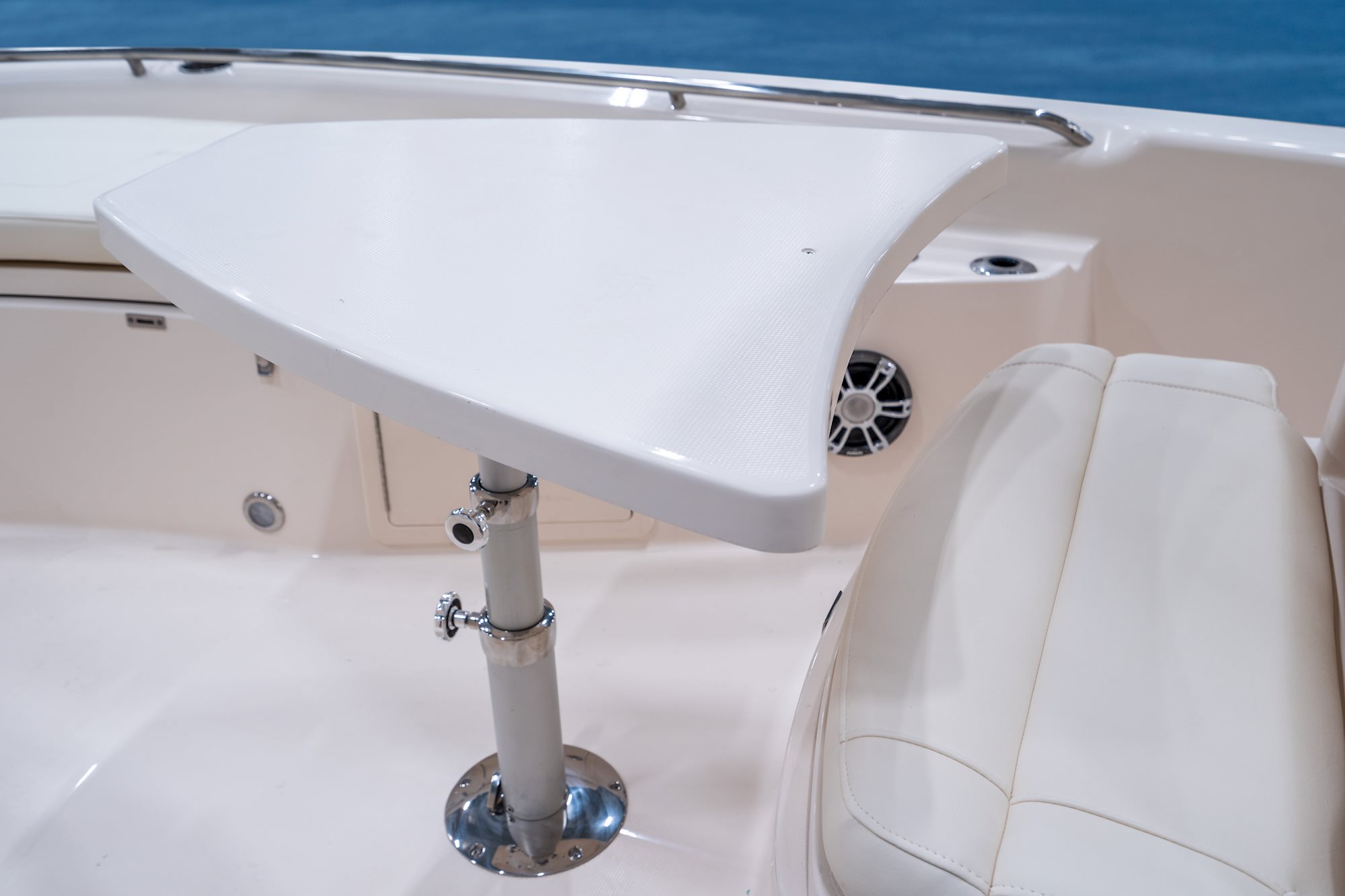 An optional table can be ordered and we highly recommend it. Not only does this table enhance the utility of the bow area for lunch or drinks, but it also comes with a cushion and a telescoping pedestal. That means it can be lowered to convert the forward console seat into a doublewide chaise lounge… a rare commodity on a boat of this size and class. With it placed forward in the casting deck position, it can be covered with cushions making a huge bow sun pad.