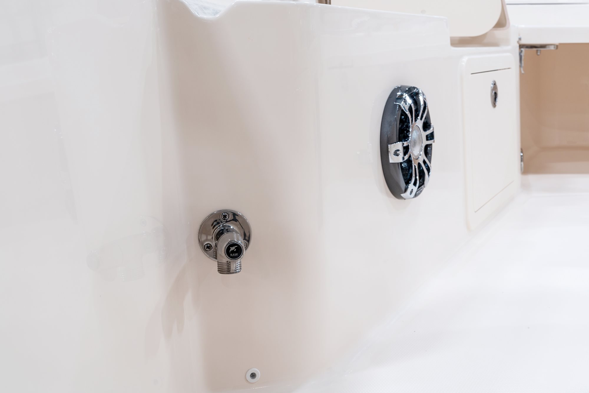 In the port caprail there’s a covered optional freshwater shower wand. Simply put a finger under the forward lip of the top, lift and pull out the sprayer. That’s all there is to it and it is frankly a better design than we see on many sportboats. It is plumbed to a 10-gallon (38 L) freshwater tank.