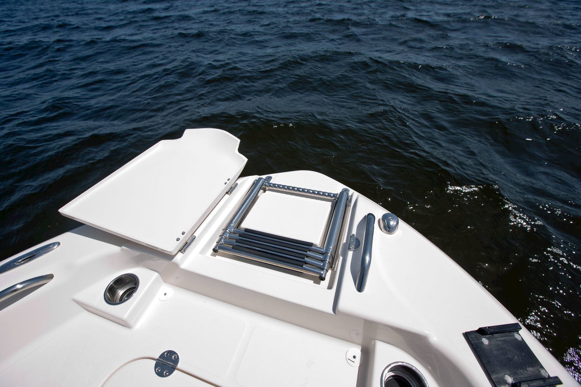 One of the unique -- and important -- standard features on the 251 CE is her beach boarding ladder. At one time or another, virtually all boaters want to beach their vessel to get off and explore or have a picnic ashore. By selecting the right beaching site, raising the outboard a bit, this 14" (.36 m) draft vessel can be easily beached and the bow ladder can be deployed. If the angle of the bottom is right, the ladder can reach dry land. Otherwise, only feet and ankles need to get wet.