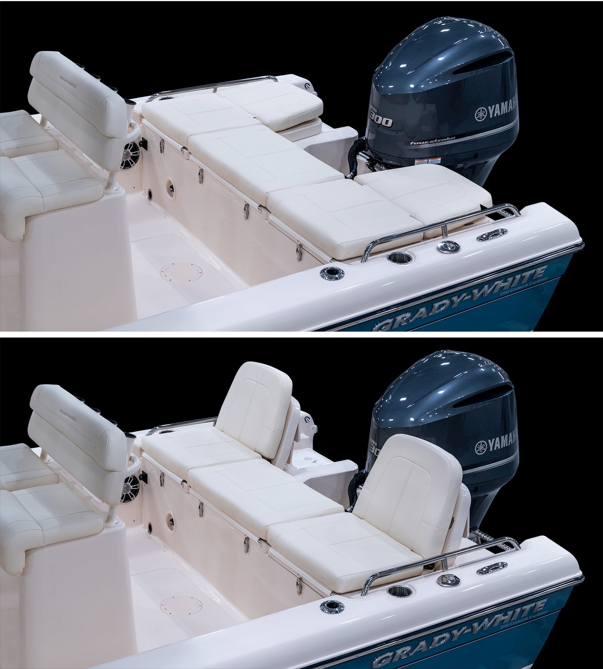 Virtually all sportboats have transom seating and so does the 251 CE. Here the seats are lying flat across the casting deck and we only have to reach back to lift the port and starboard seat backs up from their flush position. This leaves the space under the seats untouched and Grady-White was then able to hinge these to add storage underneath. This creates three-across seating with the two jump seats having seatbacks.