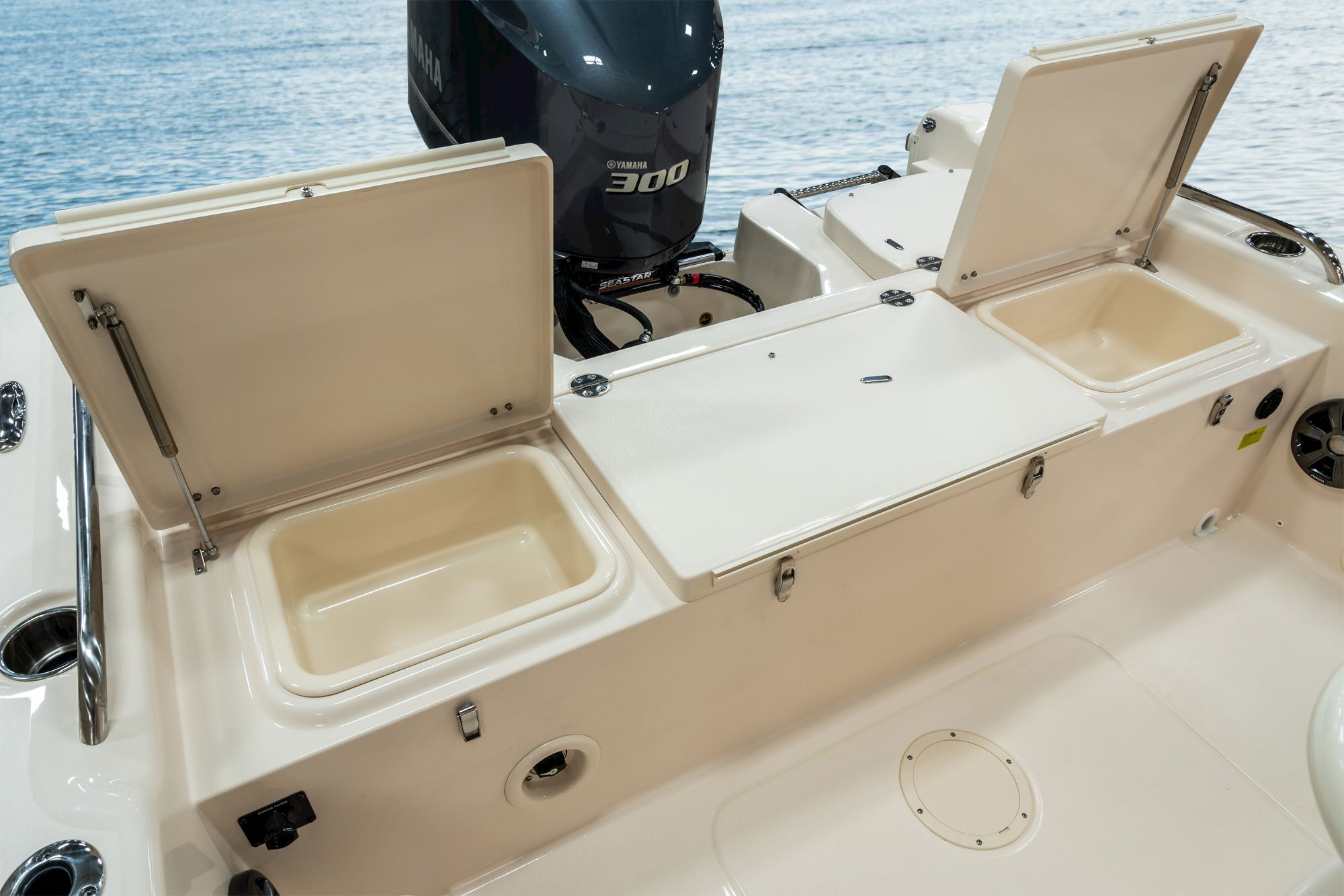 is U-shaped and provides its own measure of freedom to move about. All hardware is flush-mounted, eliminating any tripping hazards. There is storage to both sides, and a 12.75-gallon (48.3 L) insulated raw water livewell w/light & ob drain in the middle.