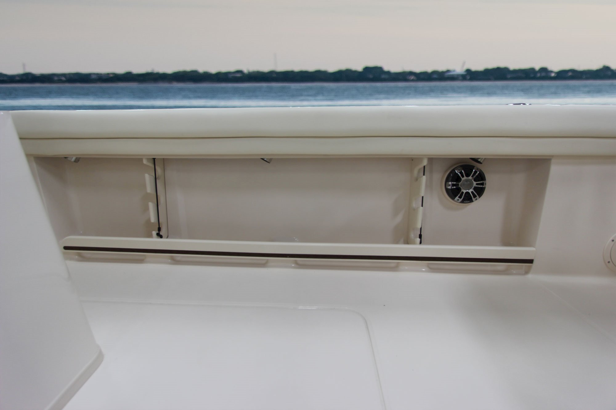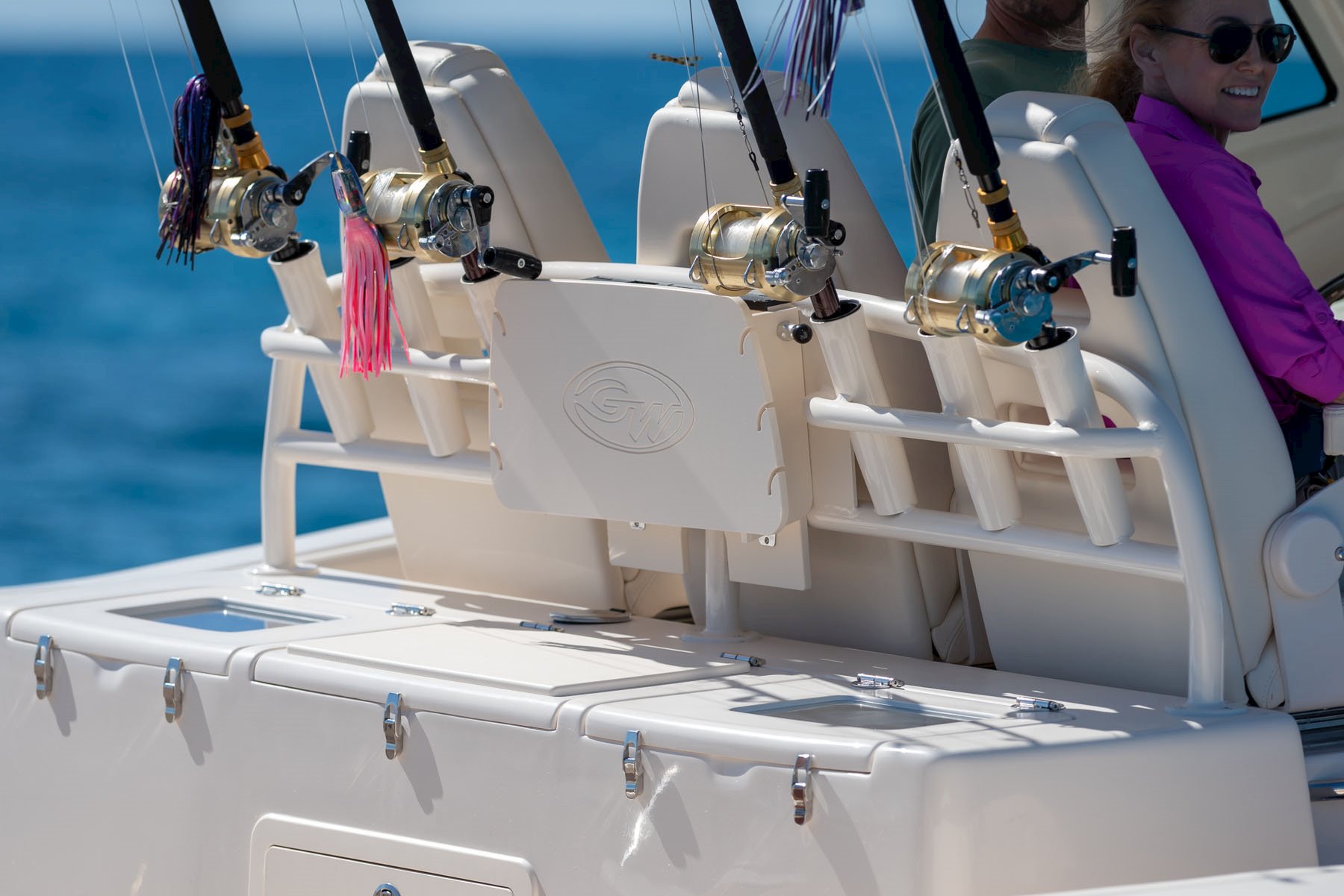 Grady-White calls the Canyon 376’s leaning post the “Deluxe Lean Bar,” and we fully agree with use of the word “Deluxe.” To port is a 41-gallon (155 L) livewell with a hatch that closes with two 316 grade stainless steel latches and has a clear acrylic center section. In the middle, a cleaver tackle box holder flips down and has a tray where riggers can secure a tackle box. To starboard, a 164 qt. (155 L) cooler is standard, and it can be replaced with an optional second 41-gallon (155 L) livewell. Below are storage drawers and dedicated slots for tackle boxes.