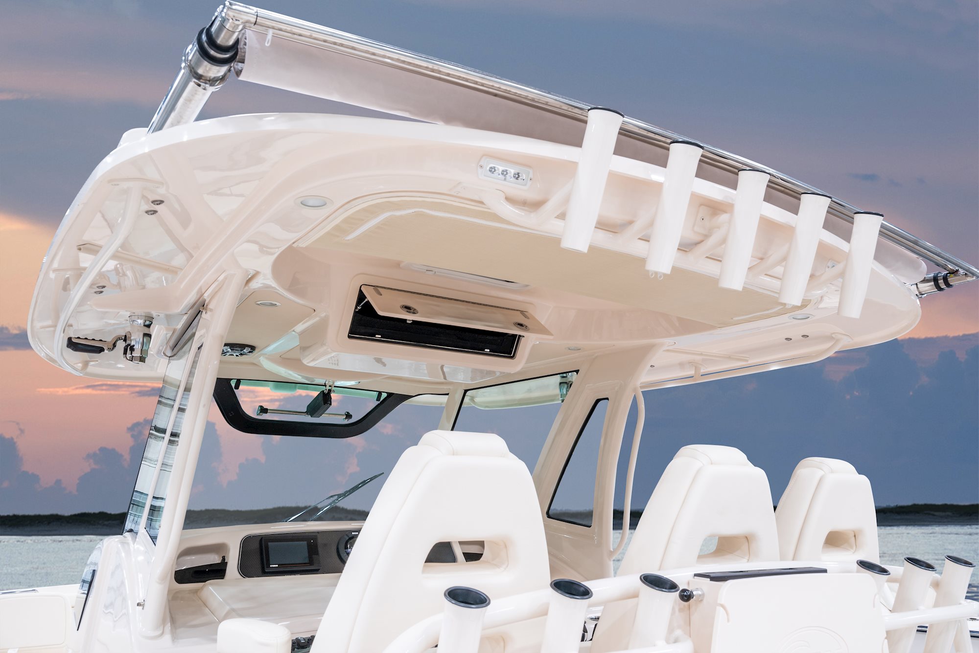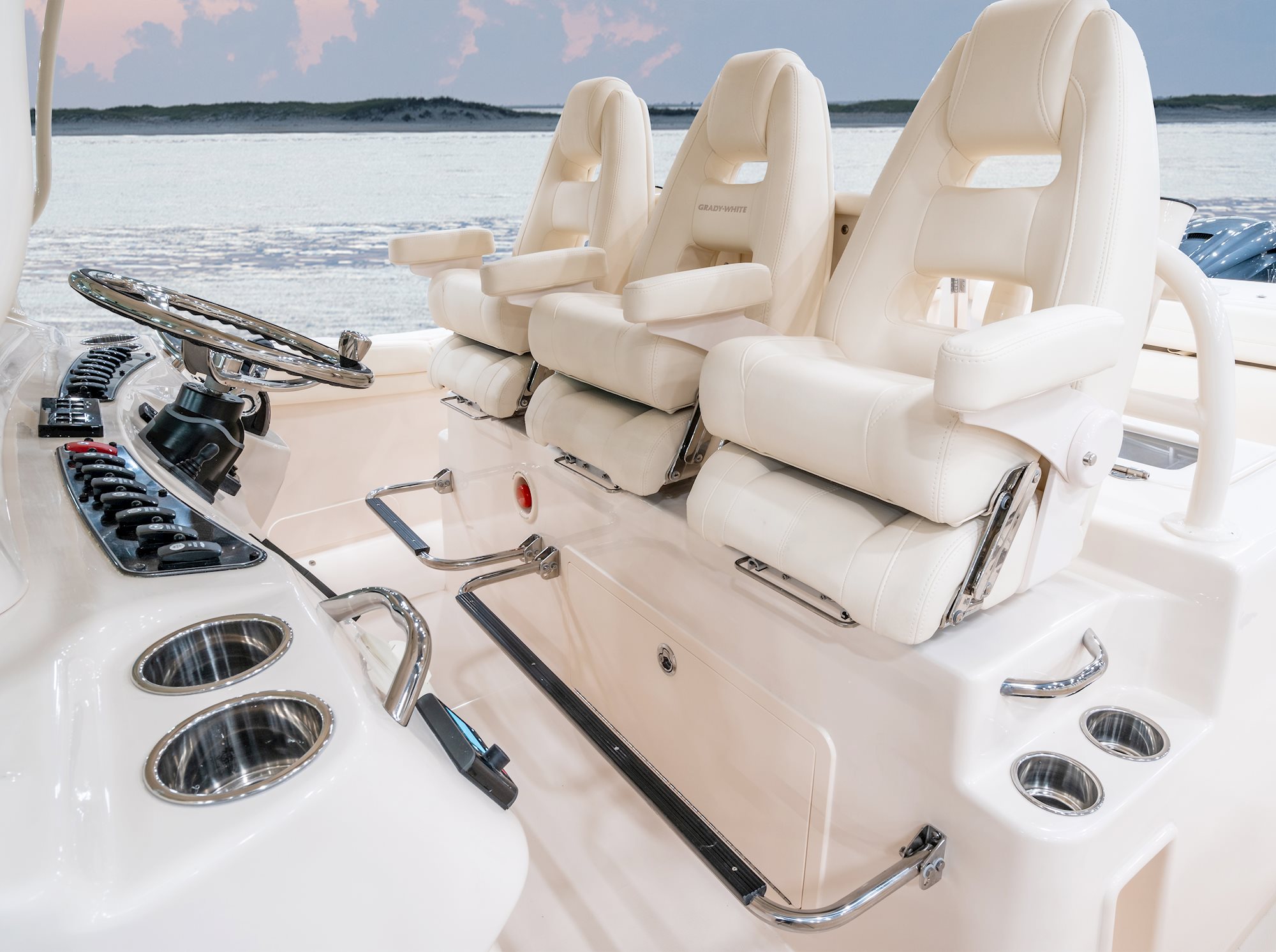Grady-White uses what it calls the SeaV2 hull on all its boats. It’s a continuously variable V-shaped design that utilizes variable deadrise measurements throughout the bottom. It sharpens from the transom (20-degrees) to about 30-degrees amidships and a steeper entry at the bow. The hull was designed by C. Raymond Hunt & Associates, which has more experience with deep-V hulls than any other naval architect.