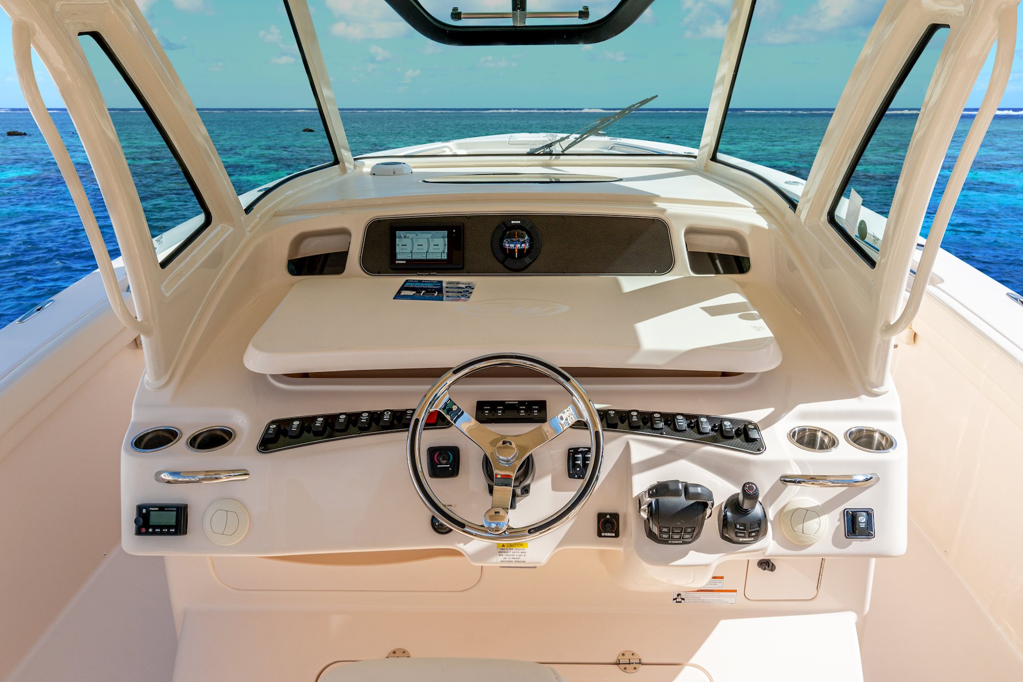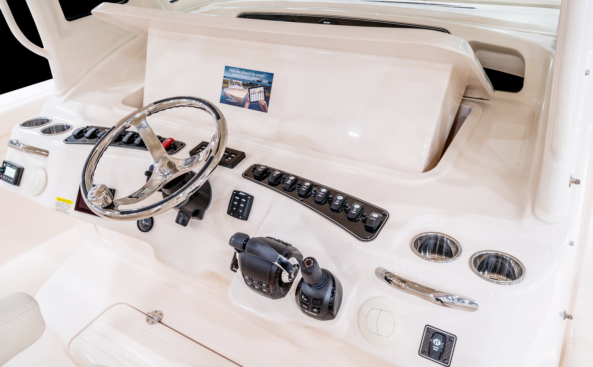 At the Canyon 376’s helm, the steering wheel is centrally positioned with the engine controls to starboard and the trim tab buttons just outboard of them. Engine instruments and the compass are in a glare-killing black panel forward of an electronics panel that raises when needed and tucks back into the dash with the push of a button.