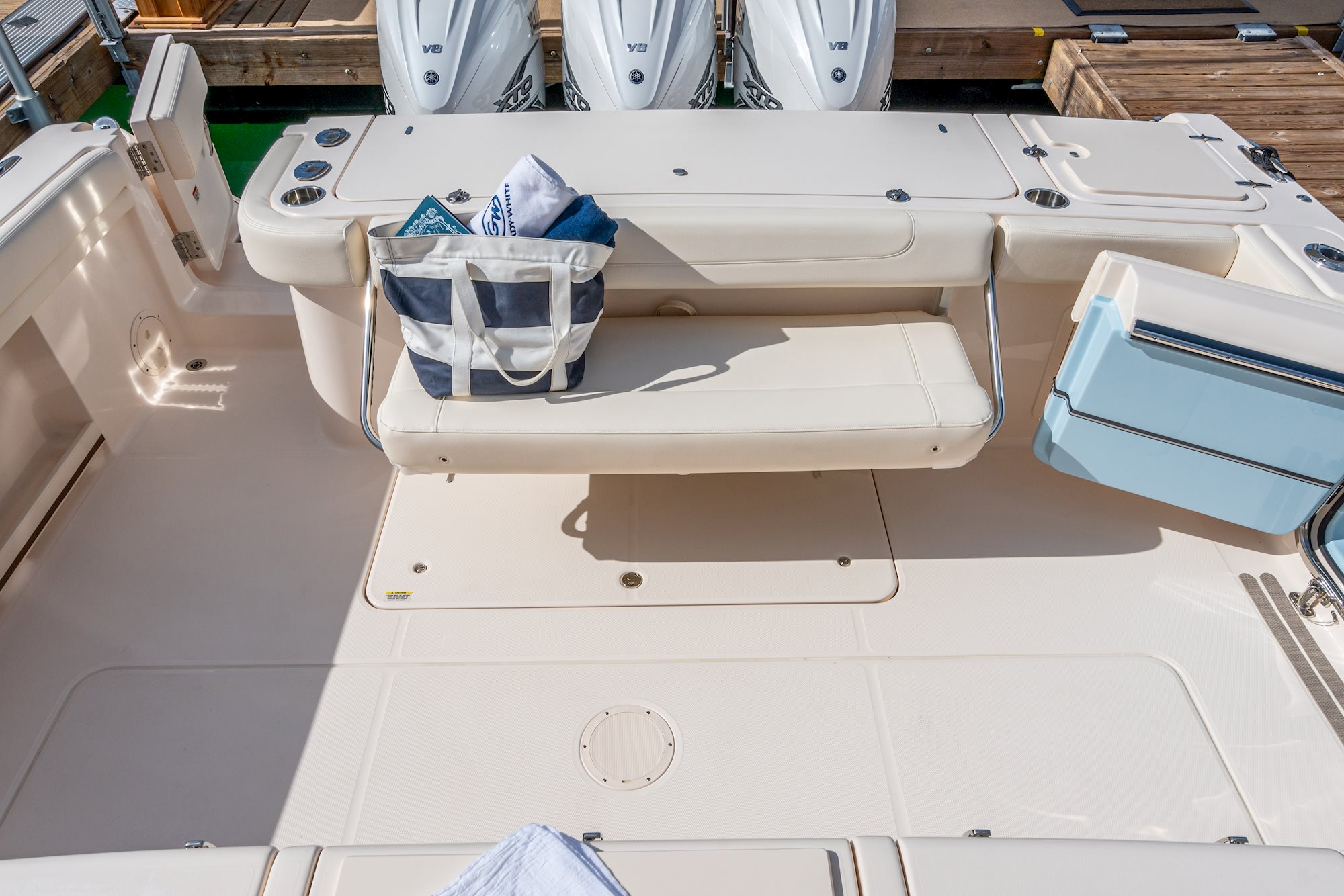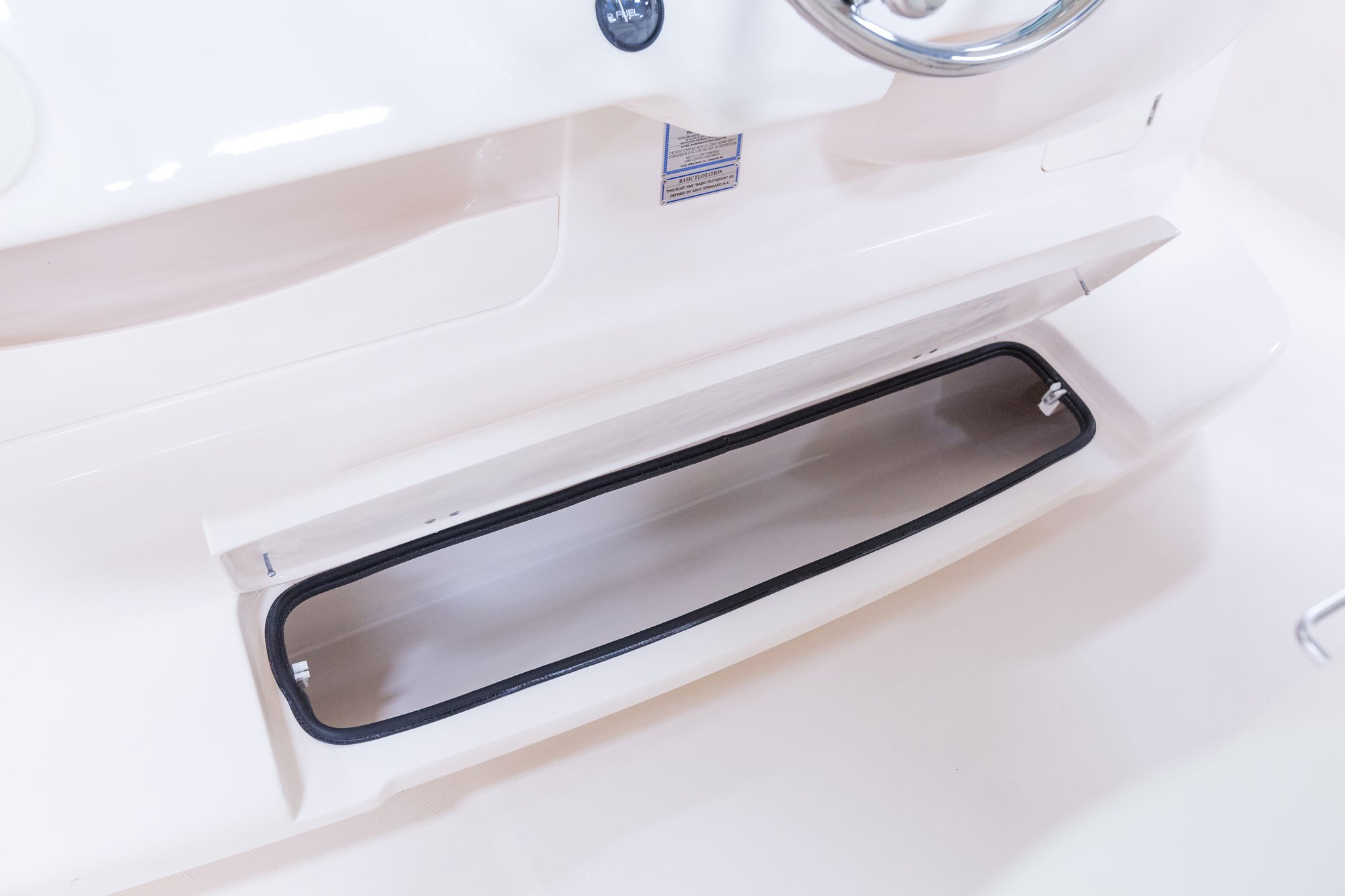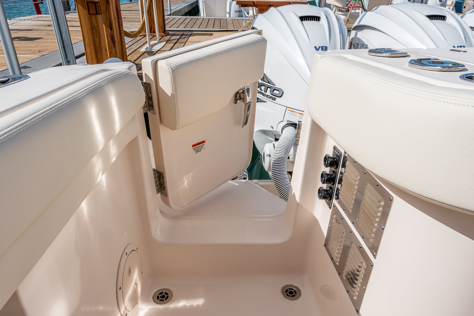 In a boat this size, there’s space abaft the console for three-across seating. The captain drives from the center with a companion on each side. Each seat has folding armrests and a bolster that also folds up, so passengers can choose between standing and sitting. There are two fold-down footrests below on the base of the seats as well as an angled step forward on the console that passengers can brace against. This console step is also hinged and opens a storage compartment.