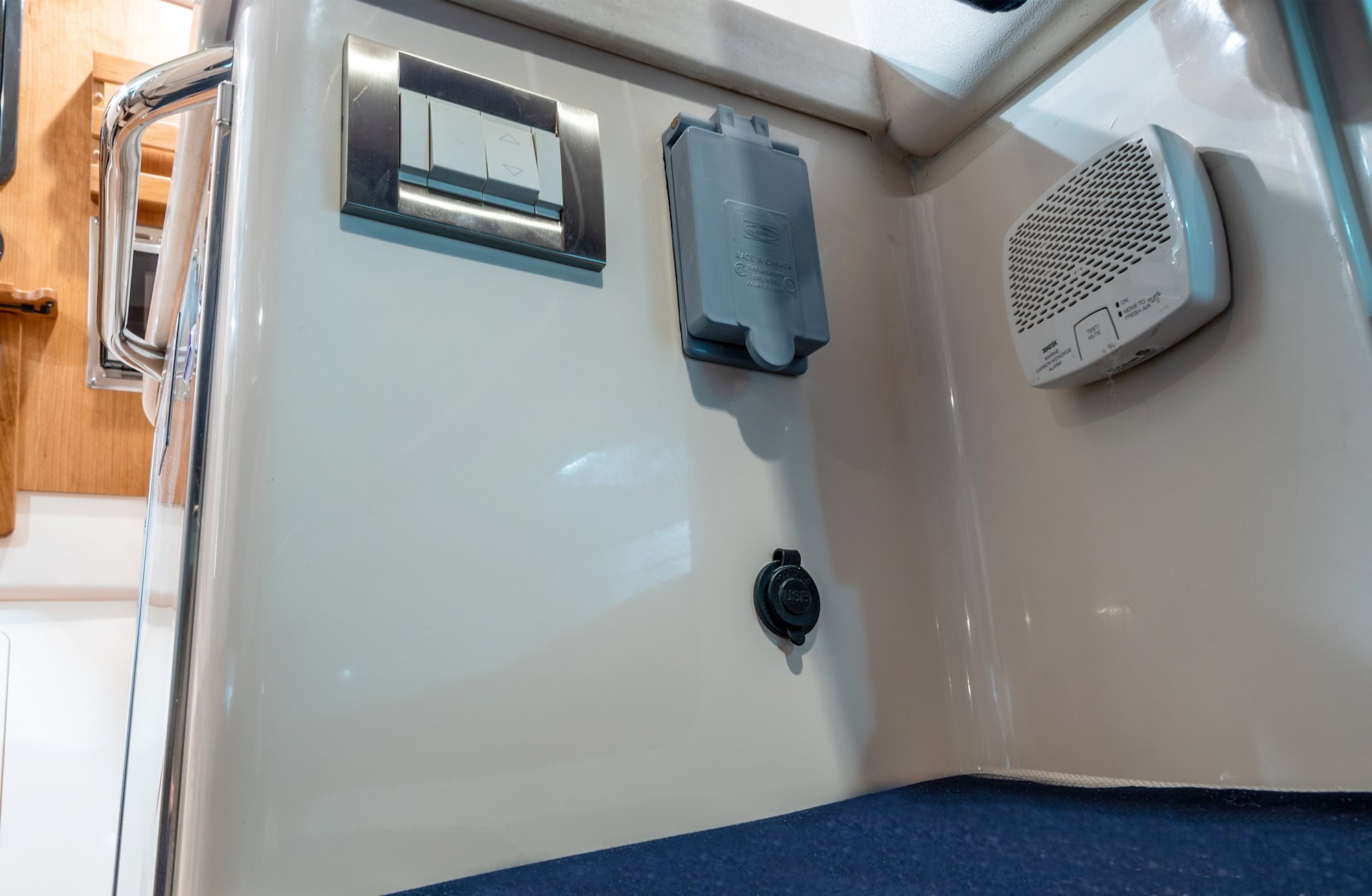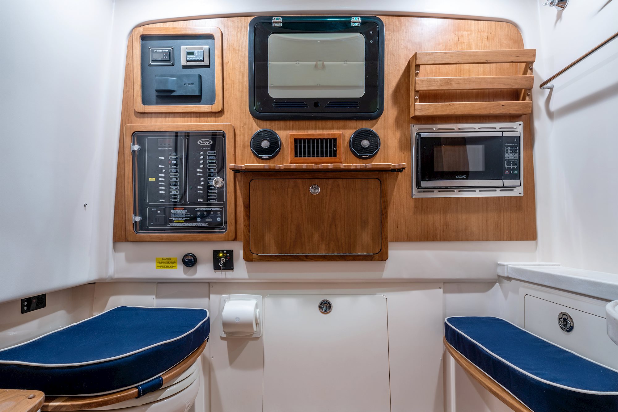 Moving forward, a hatch in the starboard side of the console provides access to the Canyon 376’s cabin. Two steps lead down to a teak sole that looks good and is easy to maintain. A small galley to port has a stainless-steel sink with a pull-up shower wand and refrigerator. Beneath a ventilated hatch is a VacuFlush head, and the boat has a 10-gallon (39 L) holding tank. A small lounge in the bow has a clever power backrest that raises with the push of a button to reveal a berth that sleeps two. There’s vertical rod storage as well as flexible fabric pockets for stashing gear.