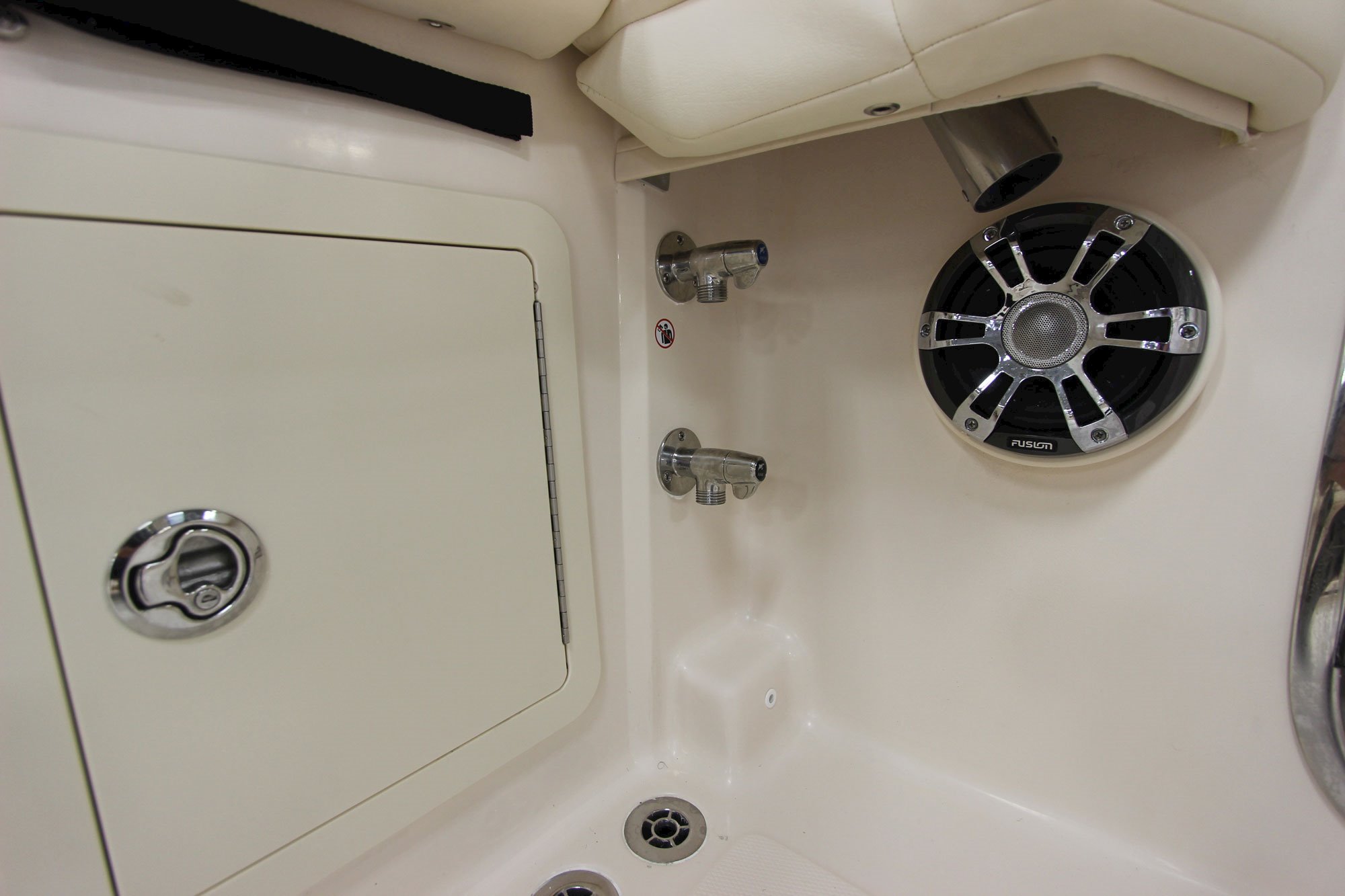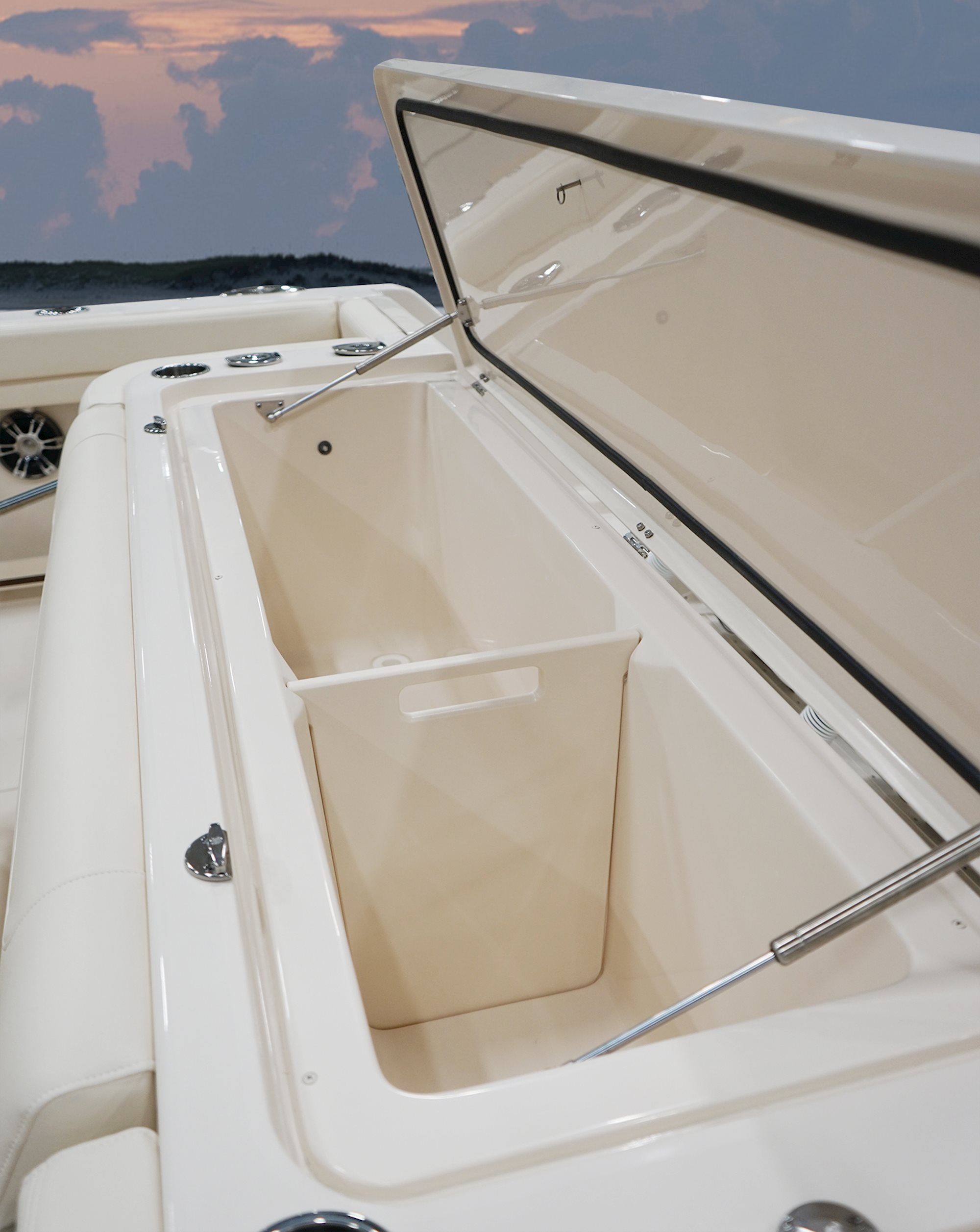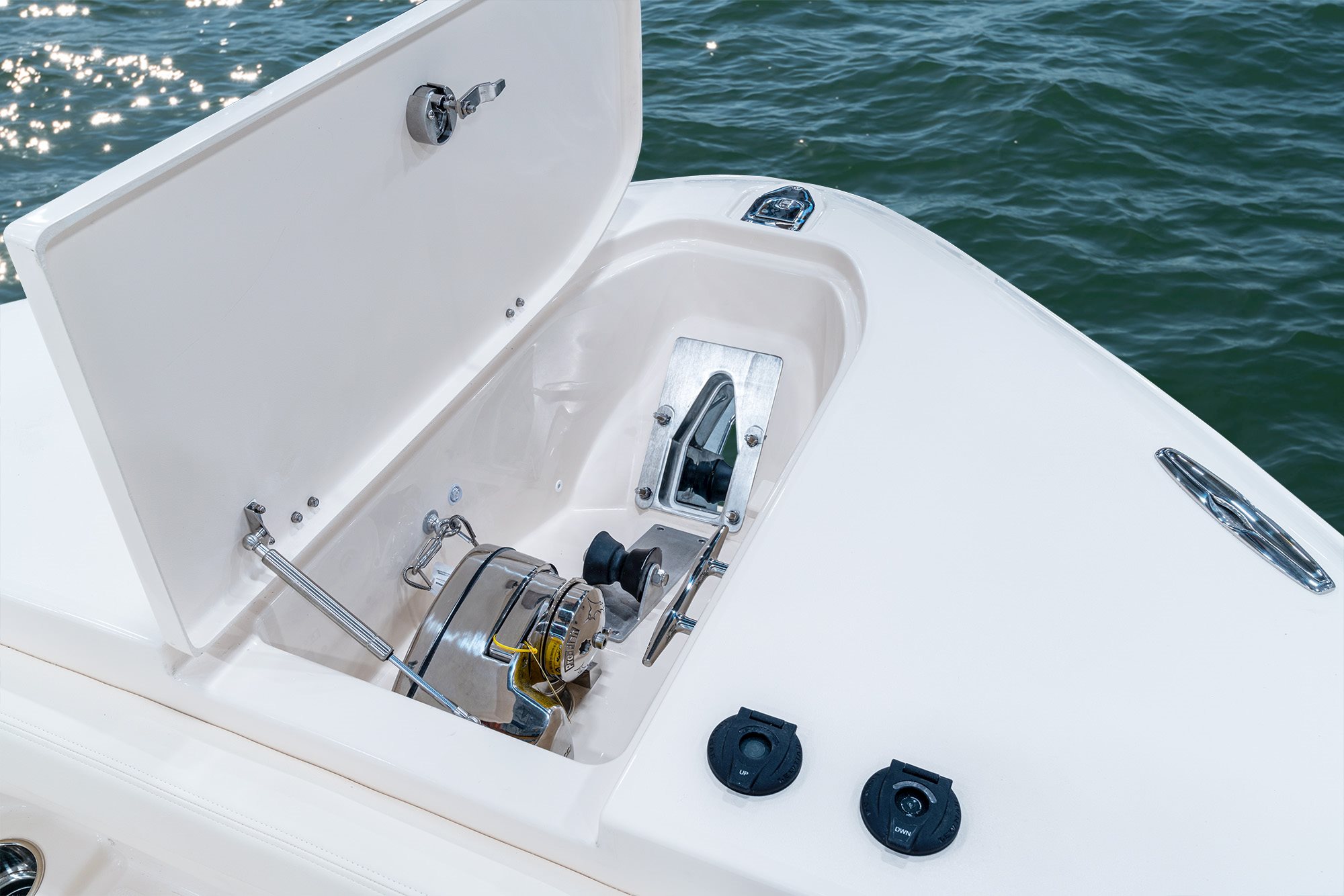 On each side, there are gunwale cutouts with rod holders, storage pockets and finished toerails. In the aft port corner, a small hatch opens to reveal the battery switches. In the center of the sole is a hatch that allows access to pumps and other equipment.