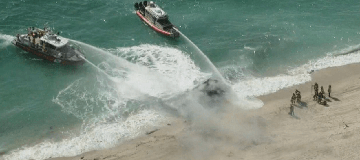 Fort Lauderdale Fire Rescue (FLFR) confirmed to local news reporters that the boat fire had been called in near Port Everglades just before 10 a.m. At the scene, two FLFR boats were seen dousing the charred vessel that was washed ashore on a nearby beach. Firefighters were also seen on the beach near the burnt boat.