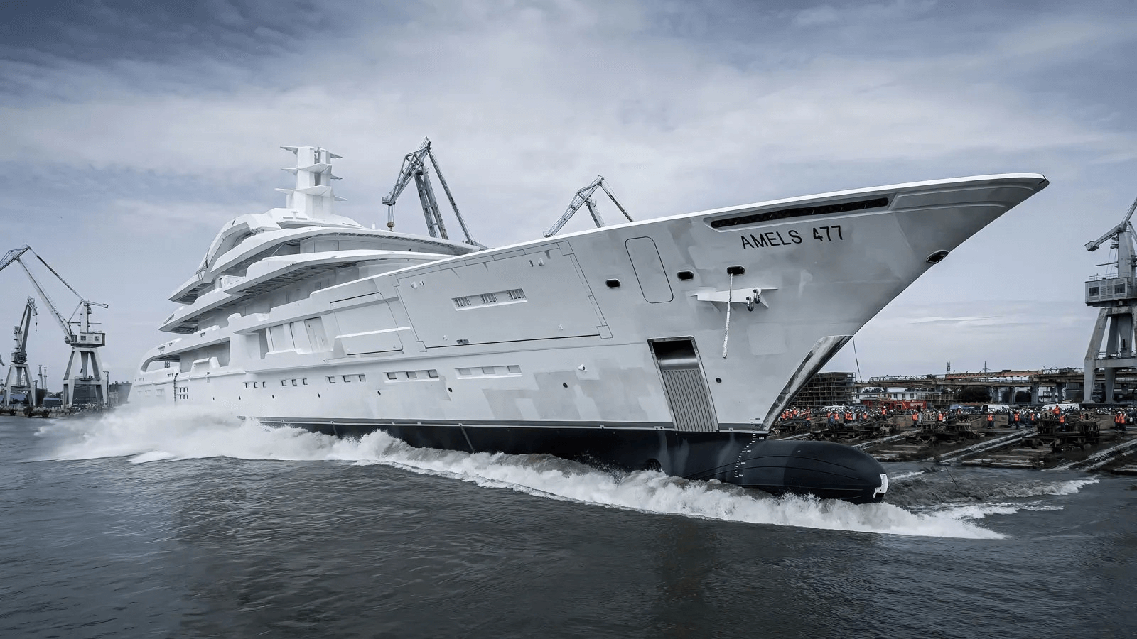 Set to become the flagship of Amels, Project Tanzanite is a 120-meter motor yacht under construction in the Netherlands, with delivery slated for 2025. Designed by Espen Øino, she is currently the largest yacht in build in the Netherlands and was last seen arriving at Damen Yachting’s Vlissingen facility in June 2023 for outfitting. Interior renderings revealed in May 2024 by Zuretti Design showcase a warm, contemporary aesthetic with a cream and brown palette. The interior proposal also shows the yacht to be fitted with curved furniture, completed by wood and marble accents.