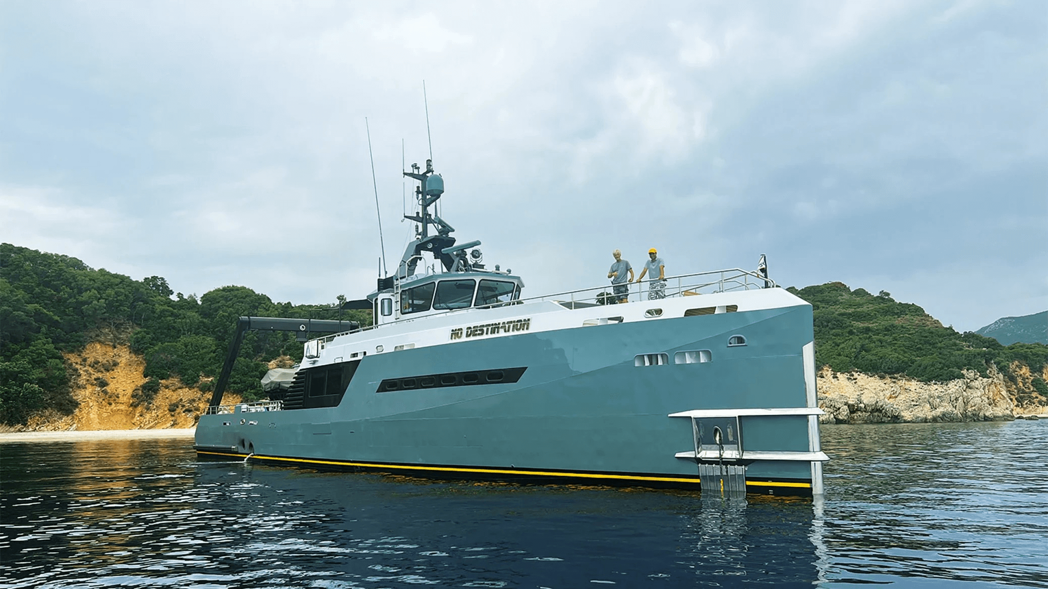 Miniea was busy researching whether he wanted to build a yacht in Turkey or Singapore when he stumbled upon a 33-meter vessel for sale on the Damen Trading website, which sells used commercial vessels. “I went to look at it, and I bought the boat in one hour,” says Miniea of the Damen commercial vessel that would become No Destination.