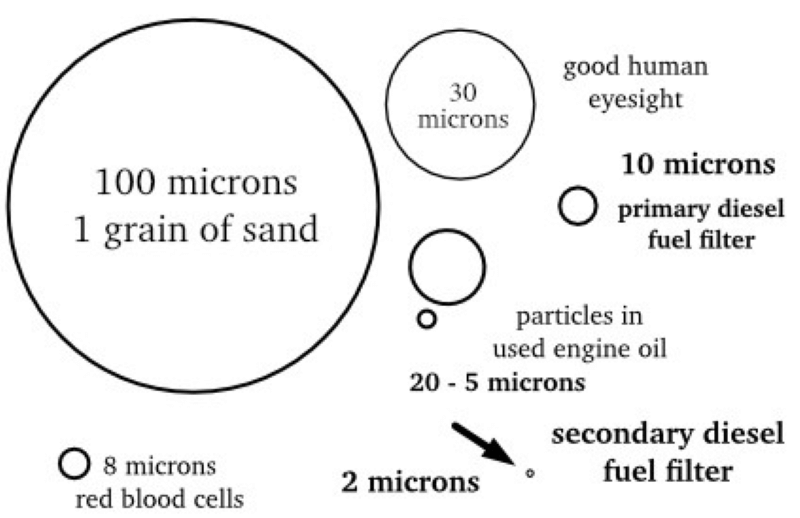This is the last defense to prevent dirt or HUM slime reaching the injection pump. The filter either uses a replaceable element or a canister (similar to a small oil filter). The filter element should be two microns; however few manufacturers state the micron size on their replacement canisters.