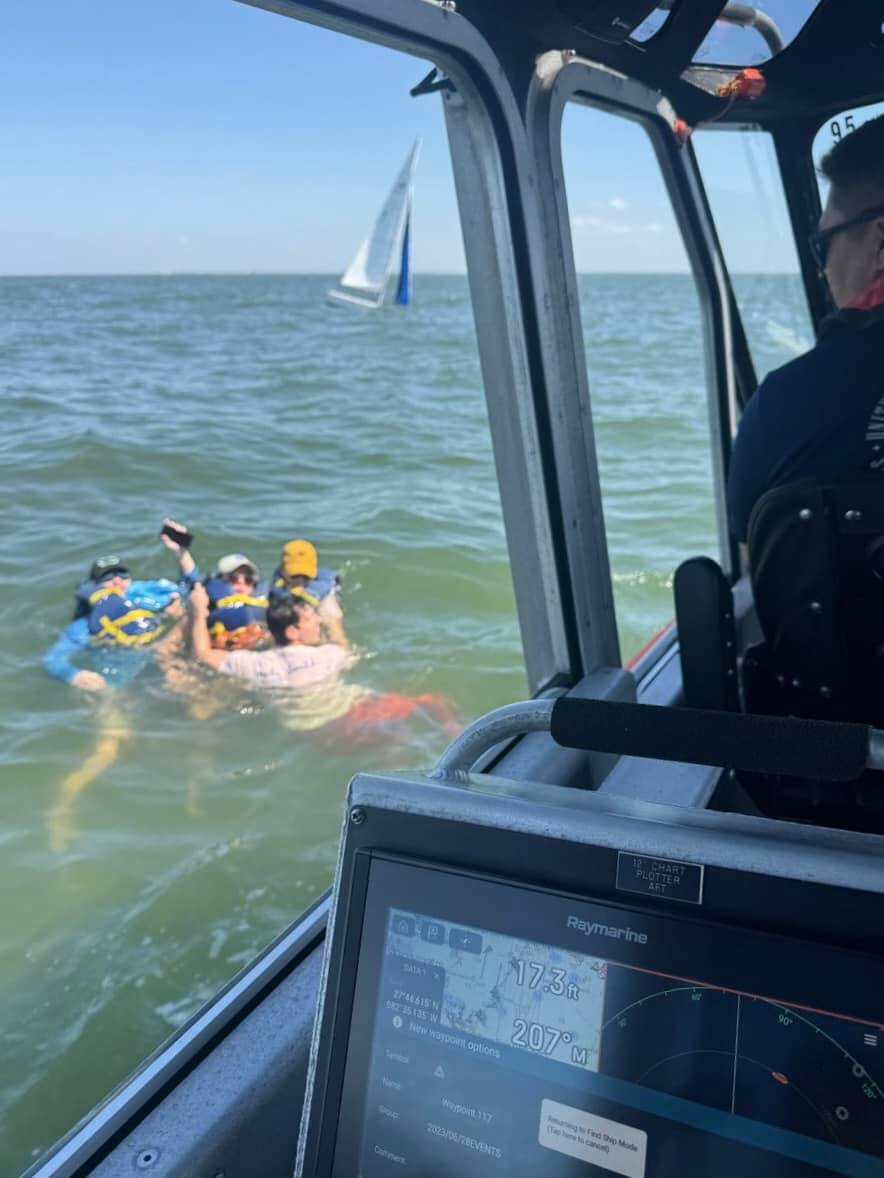 Watchstanders at Coast Guard Sector St. Petersburg likely received a distress call or notification regarding the sinking vessel, dispatching a crew aboard a Response Boat–Small (RB-S) from the nearby station. Upon arrival at the scene, the Coast Guard crew found the four boaters in the water near their partially submerged 18-foot sailboat.