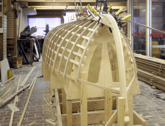 Joinerwork can make up to 10 to 15% of a vessel’s overall weight.  Building exotic, lightweight joinerwork is extremely expensive, both in man hours and cost of materials.  We have found, however, that we can approach the weight of exotic construction simply by using solid ¼” plywood to fabricate joinery rather than commonly used ½” plywood.  Quarter inch plywood, stiffened from behind as necessary with one-by-one strips is more than adequate for most joinery applications.  Quarter inch plywood weighs 3/4 #/ft2.