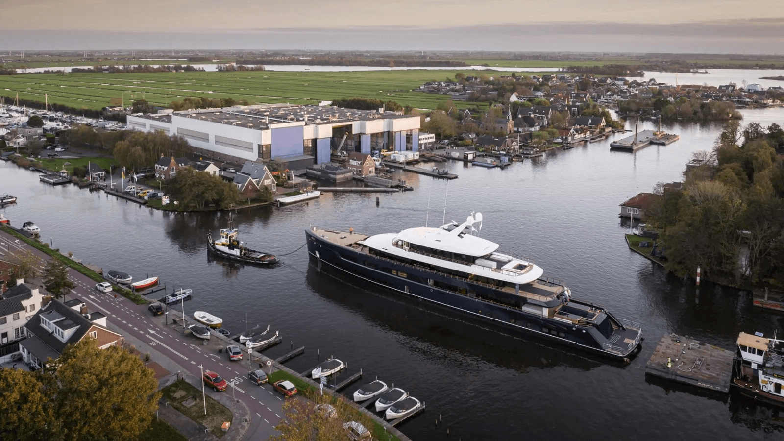 One was last spotted in July 2023 following her technical launch, where she was photographed on transport through the Dutch canals. Imagery reveals a two-tone exterior by Studio De Voogt, with distinctive metal railings to contrast the yacht's long line of dark windows.