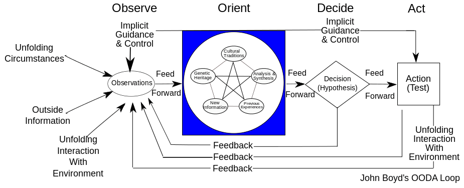 His other major theory, and the focus of this article, is what Boyd claimed set him apart as a fighter pilot. It wasn’t that he thought he was smarter than other pilots, although he did – he had a reputation for arrogance and stubbornness – it was because, when he was behind the stick, he had an iterative process that he did not deviate from. This process became a central theory of fighter pilot training and has since been adapted for general aviation training (where I was first exposed to it), business, politics and sports.