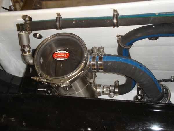 I checked the expansion tank’s coolant cap, water pump, the various hoses, clamps, and exhaust riser before taking a look at the raw water sea strainer. After unscrewing the lid, I detected bits and pieces of thin plastic.