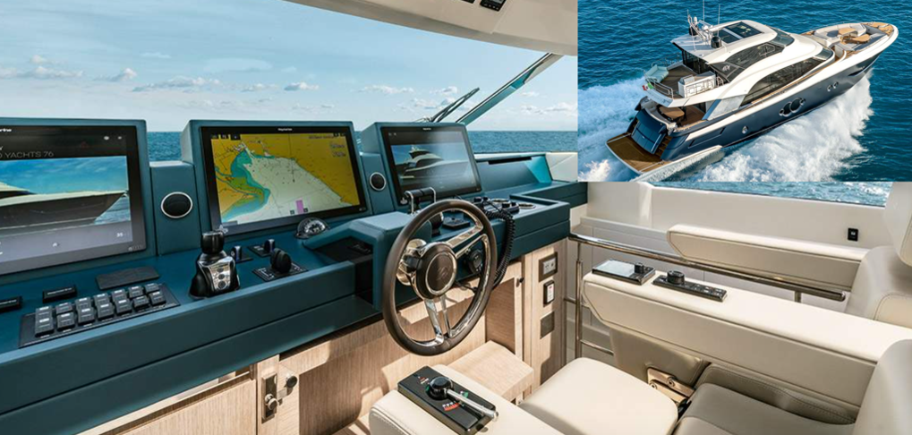 The Monte Carlo Yachts MCY 76 Skylounge has an enclosed flying bridge that not only creates an additional social zone, but it also includes the motoryacht’s helm. There are twin high-backed captain’s chairs and the centrally-positioned helmsman’s seat has controls for the engine displays, the MFDs and the autopilot on the armrests. Forward, the dash has triple multifunction displays. It’s the first yacht of its kind to come from an Italian shipyard and she is impressive. More...