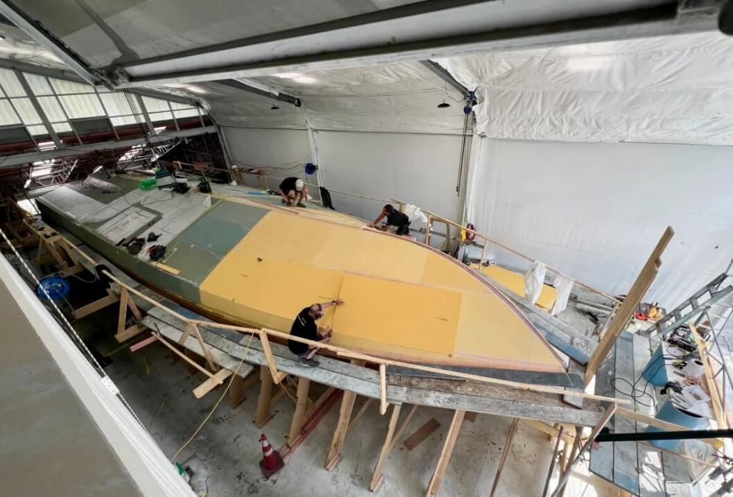 As illustrated, the hull construction is progressing well, using a modern composite foam core build method, which departs from traditional practices.