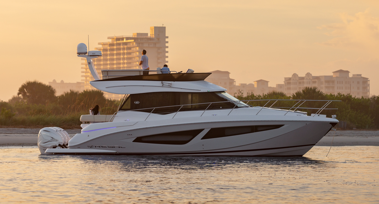 Regal Marine re-designed the 42 FXO flying bridge yacht for triple outboards to make her a more versatile boat for families who don’t want inboard power. By doing so, Regal is getting in front of a trend that has been developing, and it is one of the few 42' (12.8 m) flybridge yachts on the market with outboard power. Maintenance is simple because it is done once a year or every 100 hours by the dealer. Just keep an eye on the oil. The FXO is powered by triple Yamaha 425s, and we scored a WOT speed of 49.4 mph during our tests.