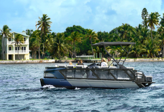 NEW VIDEO! The Sea-Doo Switch rewrites the book on pontoon/tri-toon boats, combining safe water-jet propulsion with an innovative modular deck layout and handlebar steering that is truly different. The Switch comes in nominal 16’ and 19’ models, with trailers included, and she rides on composite pontoons rather than aluminum.