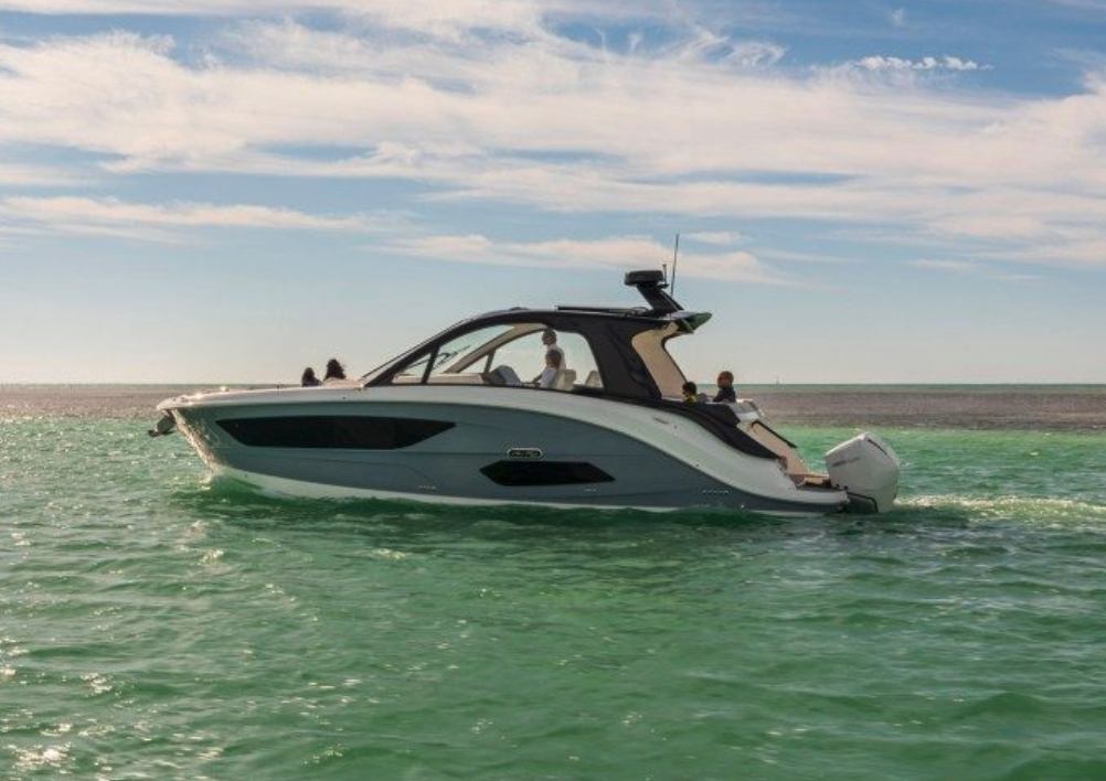 The 2021 Sundancer 370 Outboard is the first of a new line of Sea Ray day boats with outboard engines. She is powered by triple 300-hp Mercury Verados that pushed our test boat to a top speed of 50.8 mph at 5900 rpm. We found best cruise at 4500 rpm, where the boat ran 38.2 mph and got .9 mpg, giving her a range of 201 statute miles. Her helm has a thoroughly modern execution – yet the operator can sit or stand at the helm and have virtually un-obstructed visibility with thin mullions and lots of glass going all the way up to integrate with the hardtop. This is not your parents' Sundancer, she’s a whole new game. More...