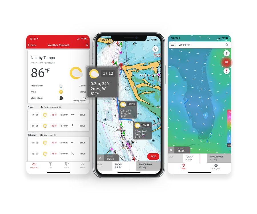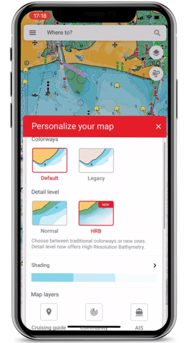 - Chart personalization: boat size, favorite units of measurement, favorite map type of view mode