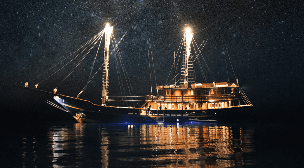 Bioluminescence glitters in the water to port, where we’re riveted to a show just below the surface. A squid followed by a cloud of nervous minnows and then an undulating banded sea snake thread their ways through the sparkles. There are stars in the sky and stars in the water. We haven’t even started sailing here in Indonesia’s Coral Triangle, but magic is already all around.