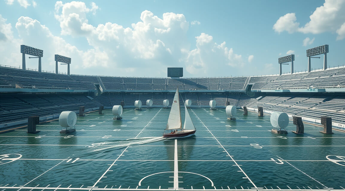 Well, you can now sail in competition in what is called “Arena Sailing.” Think of a football field filled with water and huge electric fans mounted all around the perimeter. The Arena is closed to the elements and climate controlled. The electric fans provide dependable breezes. Spectators can sit around the artificial lake in grandstands cheering on their favorites. (Equally exciting for the spectators would be a grass growing competition in the middle of the Arena).