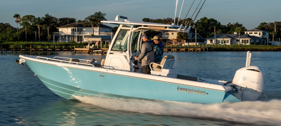 The Everglades 253 is an offshore-capable center console that can also function as a bay boat or perhaps a tender for a larger sportfish. LOA is 24’ (7.32 m), beam is 8’6” (2.44 m) dry weight 5,600 lb (2,540 kg). She carries 105 gallons (397.5 l) of fuel.