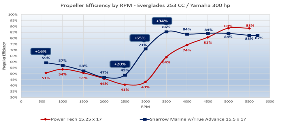 Propeller efficiency is essentially the ratio of useful work to the total power input from the engine. It’s a measurement where Sharrow’s usually do exceptionally well, and that was the case in this test.