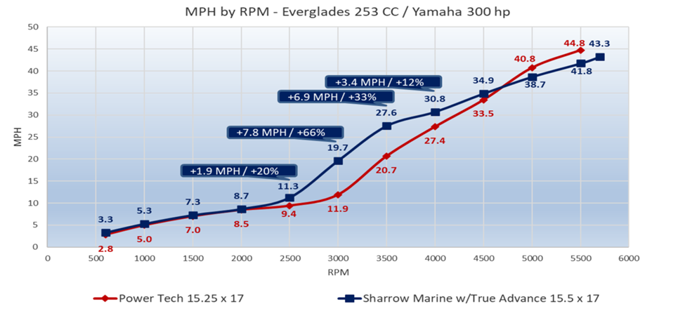 It was not quite equal the Power Tech prop at WOT, where the conventional design topped out at 44.8, the Sharrow at 43.3 mph. Note that Sharrow propellers are not designed to deliver maximum speed at WOT.