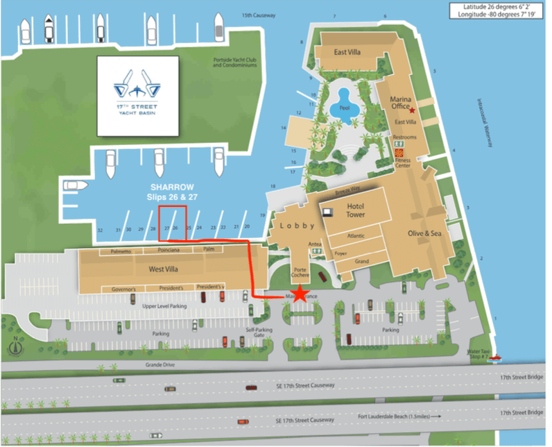 Directions: If you are driving or walking, please navigate to the Main Entrance of the Hilton Fort Lauderdale Marina, 1881 SE 17th St, Fort Lauderdale, FL 33316. You can access the dock slips (#26 and #27) from the Upper Level Parking Lot or via the hotel lobby. Look for the Sharrow flags! If you plan to use the FLIBS Complimentary Shuttle, please navigate to the Broward County Convention Center drop off location. From there, follow the sidewalk under the, 17th Street Causeway to the Main Entrance of the Hilton Fort Lauderdale Marina, 1881 SE 17th St, Fort Lauderdale, FL 33316.