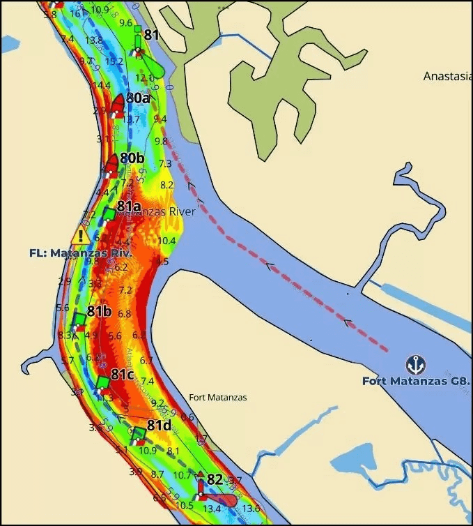 Fig 3 shows a track through Jupiter Inlet. The red track is an alternate track for deep water when the NOAA channel is shoaled (shown in blue).