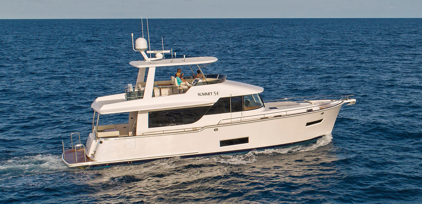 It’s been well documented that the Summit MotorYachts 54 can get up and run at a cruising speed of 21 knots, making short work of long distances on a three-day weekend getaway. No wonder, her bottom was designed by Michael Peters who has dialed in the optimum bottom shape for her mission. He’s been doing it for years for dozens of builders. When taking that well-deserved sabbatical down island for a month or two, she has a range of more than 1,200 nautical miles at displacement speeds. As can be seen above, her lower helm is to starboard with a side door that’s handy for quick exit. For docking, she has a wireless DockMate remote, which we consider the best of the type, that let us dock the boat from anywhere on board. More...