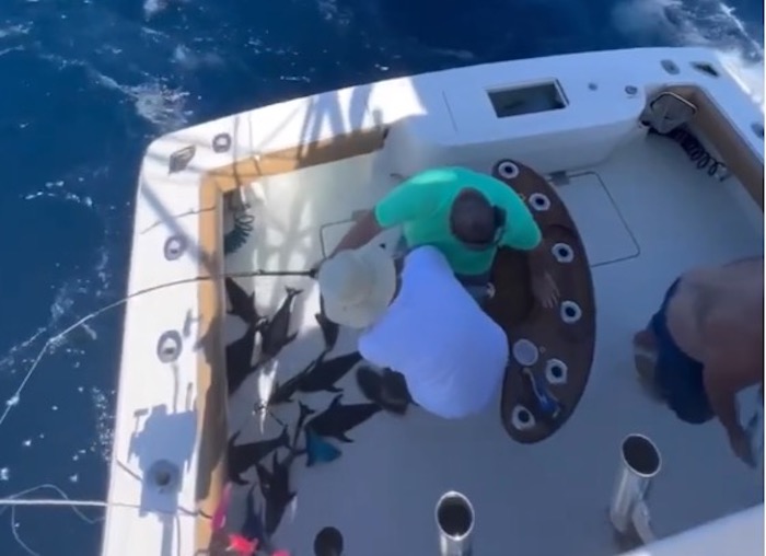 On July 18th at 10:30 AM 20 miles off Baja, California, the charter fishing boat Protocol, owned by Capt. Alex Rogers and his wife Brandi, began taking on water while hooked up with a marlin. As can be seen in the images above, the angler continued to fish while a mate was bailing out the boat. To view the video of the boat going down and to hear the edited narration of Capt. Alex, click here...