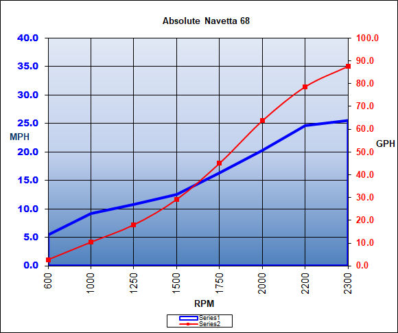 Best Cruise. At 2300 rpm, the Absolute Navetta 68 achieved an 87.7 gph fuel burn that translated to 0.3 nmpg (0.35 mpg) and a range of 210.9 nautical miles. The fuel burn remained consistent down to 1750 rpm and 14.2 knots (16.34 mph) with a range of 262.6 nautical miles. At a no-wake setting of 1000 rpm and 8 knots (9.2 mph), the fuel burn was 10.5 gph producing a range of 637 nautical miles. Minimum planing speed was 13.5 knots (15.54 mph) where the Absolute Navetta 68 range was 281.1 nautical miles. This all calculated while still reserving 10-percent of the Absolute Navetta 68’s 924.6-gallons (3,500 L) total fuel capacity.