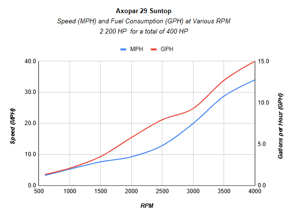 | RPM | MPH | Knots | GPH | MPG | NMPG | SM | NM | dBa |