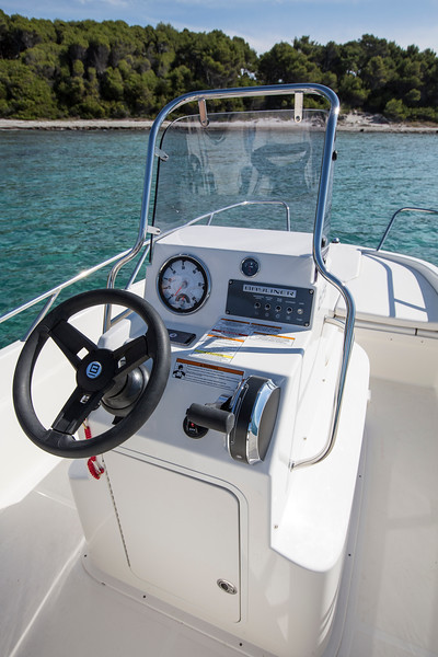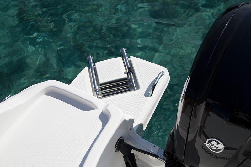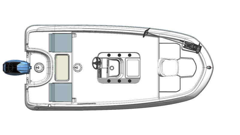 The Element CC5 joins its larger sister, the CC6, as the second in our new series of self-bailing, center console designs aimed at coastal cruising and other day boat activities. Its clean, open layout and roomy bow section considerably expands the capacity of the bow area including an anchor locker, and two, large bow storage lockers. The whole section is covered by a large bow cushion/sunpad making an ideal lounging area. The boat’s aft section features a leaning post at the helm station, plus twin jump seats flanking a roomy lined storage compartment ideal for snorkeling gear or other provisions. Dual swim platform extensions make boarding from the water easier. Our optional F5 Fishing Package converts the CC5 to a great bay fishing boat making this one as versatile as it is affordable.