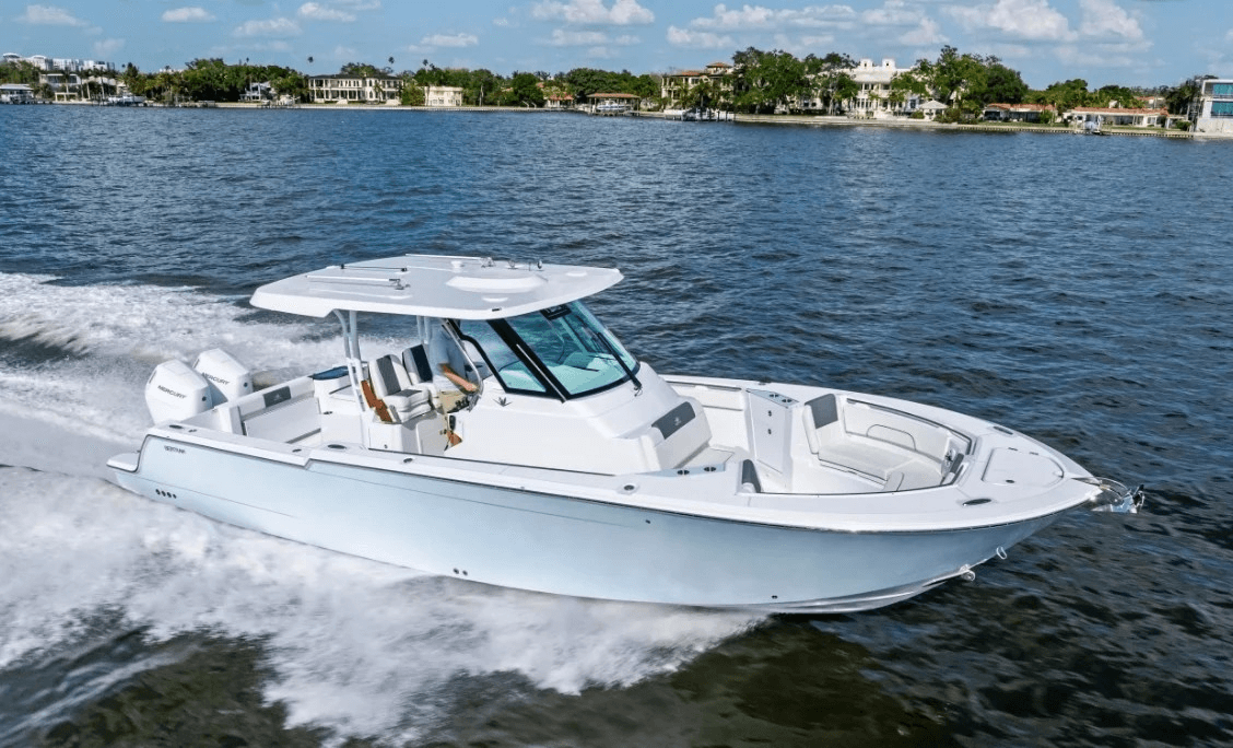 A "Real" Cabin: Unlike many center consoles that offer a small, utilitarian space, the 34CC features a genuine cabin with an air-conditioned interior. A fold-down couch converts into a queen bed, and a full head and vanity provide a level of comfort and convenience usually reserved for larger flybridge yachts.