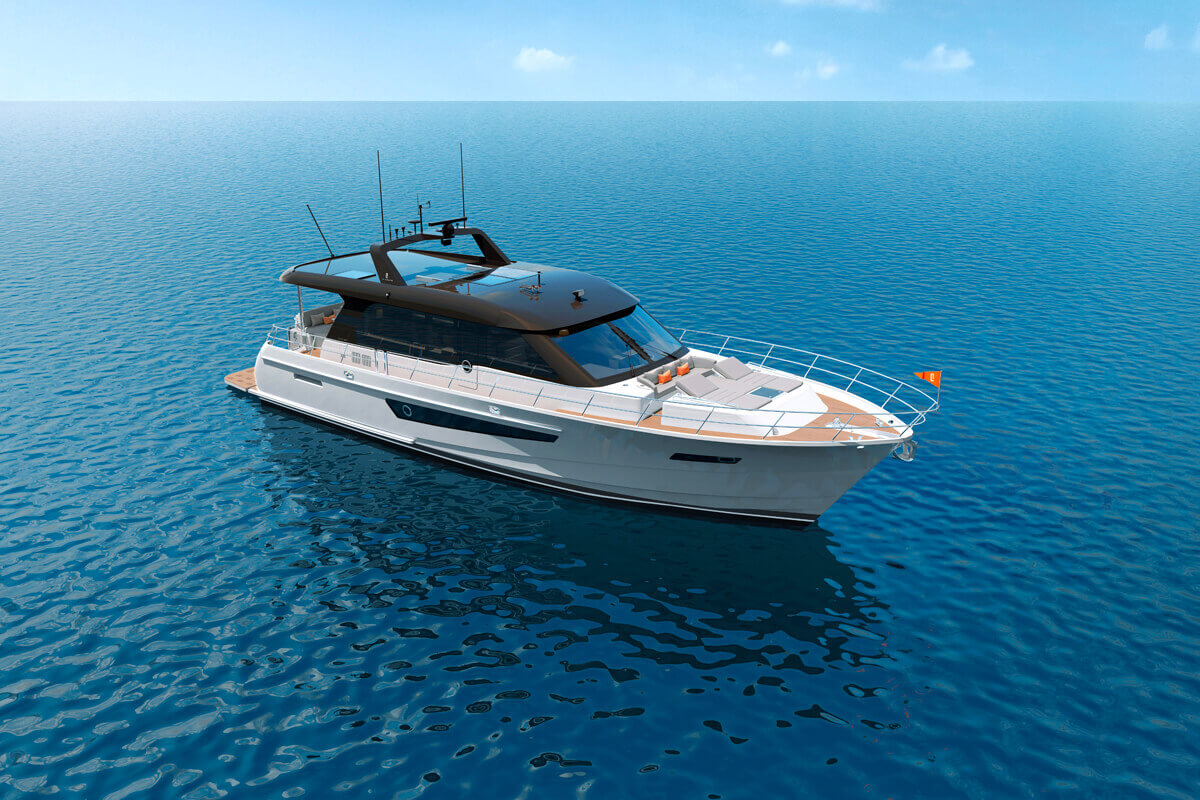 Designed with the owner-operator in mind, the sporty 19.7-metre yacht is powered by either twin Caterpillar C18 or Volvo Penta D13 diesel engines, enabling it to reach impressive top speeds of 30 knots. As an added bonus, for convenient docking, a hidden ZF JMS boat control system can be used on either wing.