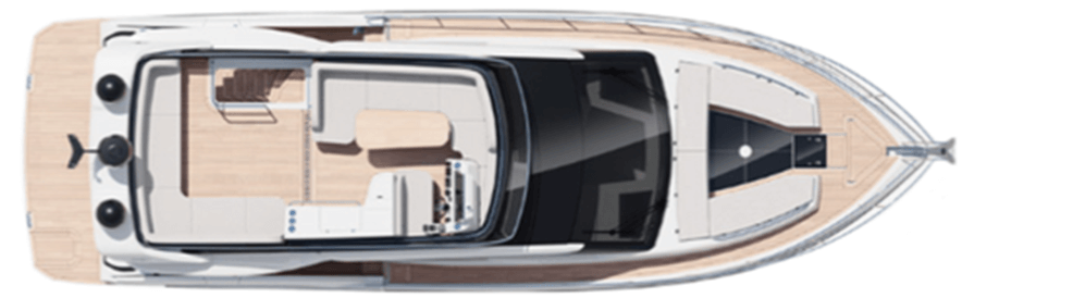 The 47’ 1” (14.35 m) LOA 480 Fly is designed to be a multi-purpose yacht serving cruising and entertaining intentions. She is an excellent boat for a couple who likes to bring along guests or perhaps extended family. She is an excellent step up to the yacht category from someone coming out of a smaller cruiser or perhaps even a center console. She has a fuel capacity of 396 gallons (1,500 L) giving her a 137 nm range at a cruise speed of 18 knots and a 371 nm range at a displacement speed of 8 knots.