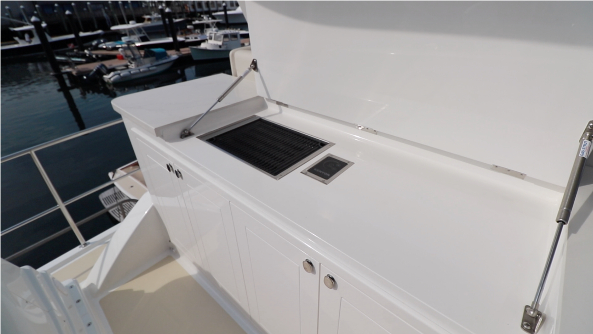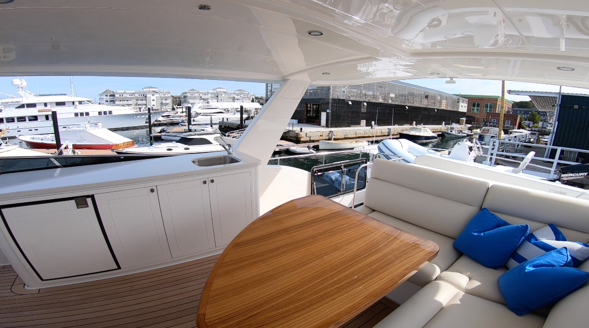 Side decks to both port and starboard facilitate boarding. The cockpit space is a wide open area that can be either populated with deck chairs or left open. There's a settee across the stern 7’6” (2.29 m) and storage is all around in the 20” (50.80 cm) high bulwarks with rails topping out at 32” (81.28 cm). Forward is a serving area with a sink, pull out trash receptacle, plenty of storage and an ice maker. To the starboard side are refrigerated drawers that can be any combination of refrigerator or freezer desired. All this is under the protection of the extended flybridge deck 7’6” (2.29 m) off of the main deck