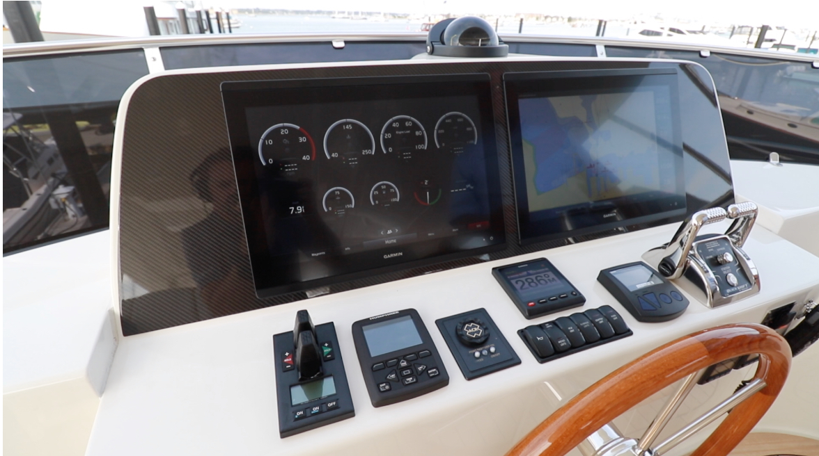 The center-mounted helm console starts with the compass mounted directly in line with the wheel. A carbon fiber panel houses two 17” (43.18 cm) multifunction displays. The autopilot is right in the center. Trim tab controls are integrated with the stabilizer controls. In the center is a beautifully finished 20” (50.80 cm) vertically mounted wheel.