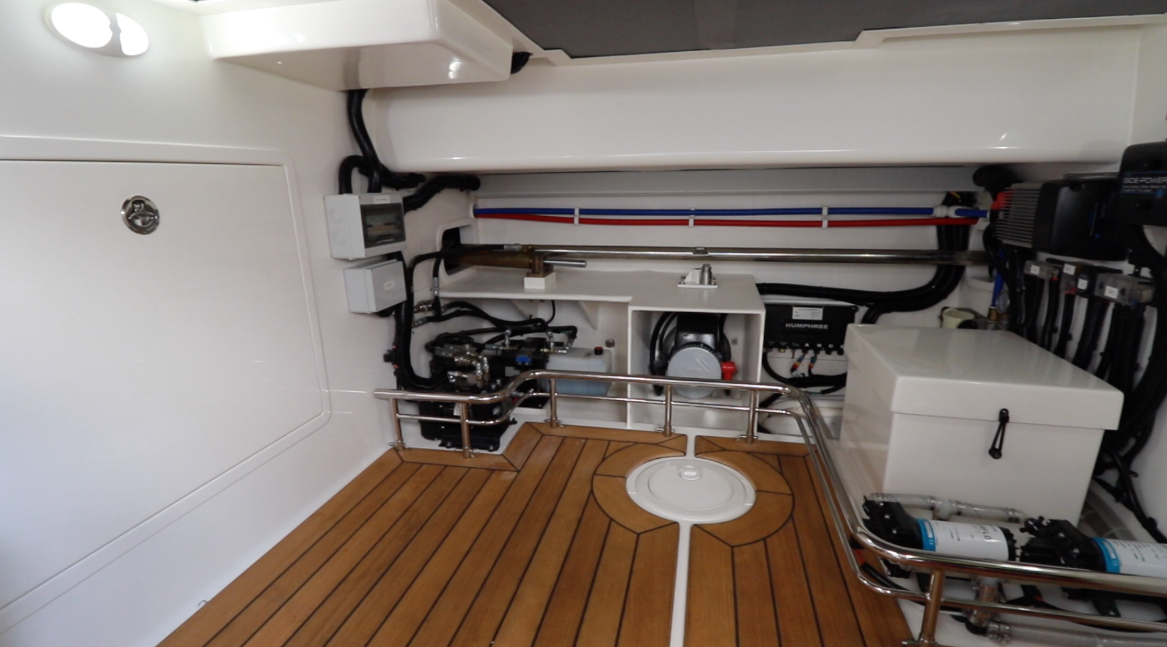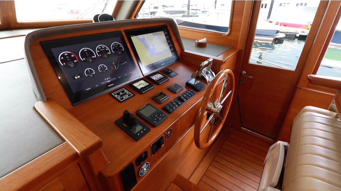 The panel has twin 17” (43.18 cm) displays. The compass is not quite in line with the helm, it’s a little bit offset. At the lower panel is a Garmin multi-data display, the autopilot, spotlight control and trim tab control. The thruster controls are electric and proportional, plus we can have activation buttons to keep pressure on them to give a slight hold against the dock for those times when operating short, or even single-handed. There are Humphree trimtab controls that, as with the upper helm, operates in conjunction with the Humphree stabilizing fins. The wheel is another beautifully finished version mounted vertically.