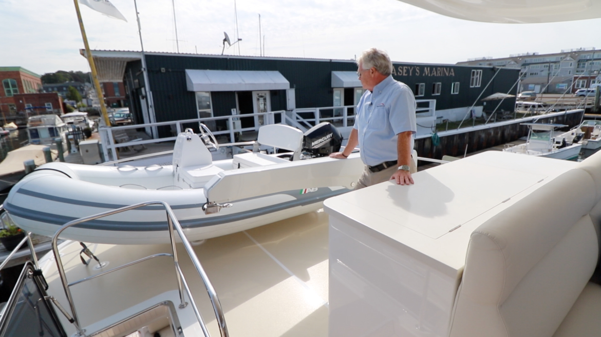 As we move aft, the teak decking gives way to nonskid decking. Ahead and against the settee seatback is a covered electric grill with storage underneath. Further aft is the boat deck, and an ES 1000 crane will be launching this 10’ (3.05 m) RIB to the port side.