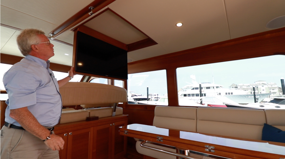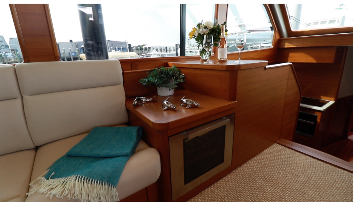 More of the Grand Banks charm and beauty just seems to come through in this GB54 interior. It presents a modern look while still maintaining a yachtlike quality. There’s opposing seating to both sides in the form of L-shaped sofas. To one side, there is an expandable pedestal table. This is not in a fixed position, so it can be brought out to the aft deck for al fresco dining. There's an overhead 6’7” (2.01 m) off the main deck and a grab handle going down the middle is one indication that this is an oceangoing boat and made to be away from the dock.